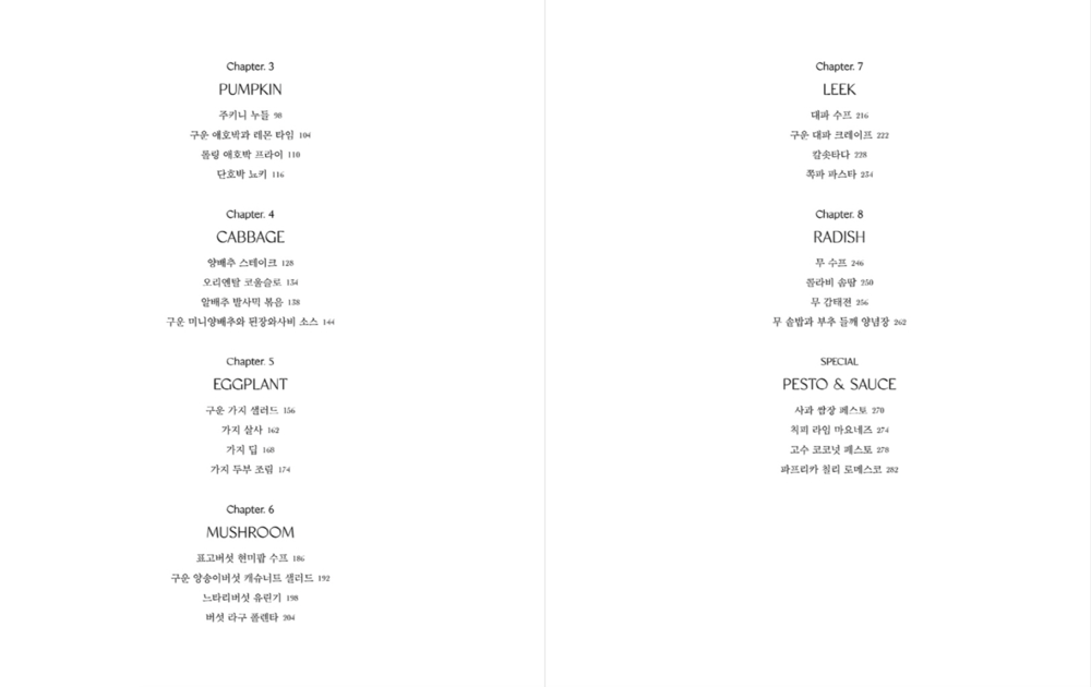 이렇듯 기존의 채소 요리가 가진 다소 심심하다는 편견을 뒤엎는 일품요리들이 쉴새없이 펼쳐지는데, 집에서 매일 해 먹고 싶은 가지 두부 조림, 무 솥밥 등의 한식에서만 그치지 않는다. 각국을 여행하며 먹었던 음식들을 추억하며 만든 스위스식 당근 뢰스티, 스페인 계절요리 칼솟타다, 느타리버섯 유린기, 콜라비 솜땀 등등 수많은 나라의 퓨전 요리들이 가장 맛있는 채소 요리로 다채롭게 등장한다. 순식간에 유럽풍 비스트로와 아시안 퀴진이 우리집 식탁에 펼쳐지는 마법 같은 경험을 하게 될 것.