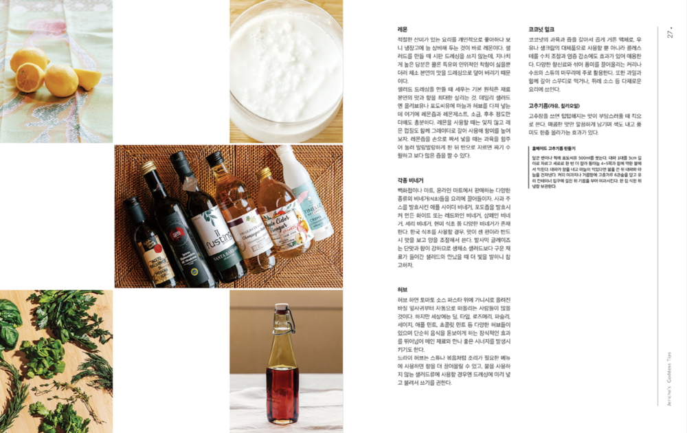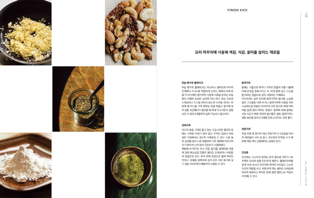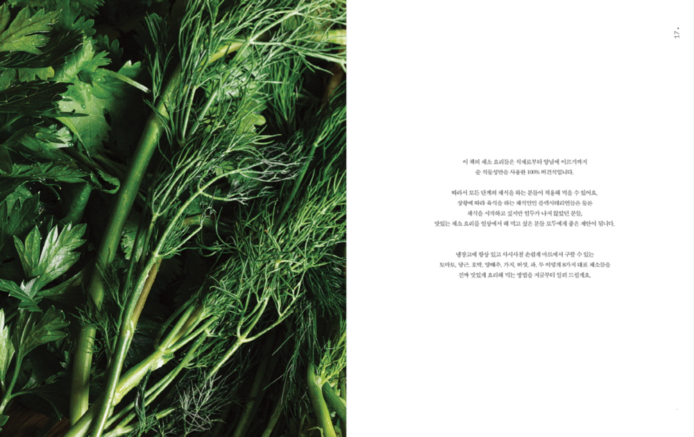 이렇듯 본인만의 색채를 살려 감각적인 플레이팅과 과감한 텍스처 사용을 이번 책에서도 유감없이 발휘한 제리코 레시피의 채소 요리를 현재 가장 주목받는 사진가 정멜멜의 시선으로 담아낸 것이 이번 책의 하이라이트.