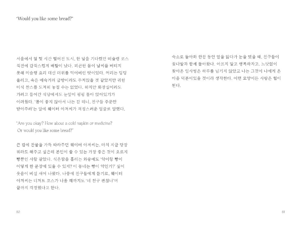 큰 컵에 찬물을 가득 따라주던 웨이터 아저씨는, 마치 지금 당장 뭐라도 해주고 싶은데 본인이 줄 수 있는 가장 좋은 것이 오로지 빵뿐인 사람 같았다. 식은땀을 흘리는 와중에도 ‘약이랑 빵이 어떻게 한 문장에 있을 수 있지? 이 동네는 빵이 약인가?’ 싶어 웃음이 비실 새어 나왔다. 나중에 친구들에게 듣기로, 웨이터 아저씨는 디저트 코스가 나올 때까지도 ‘네 친구 괜찮냐'며 끝까지 걱정했다고 한다.