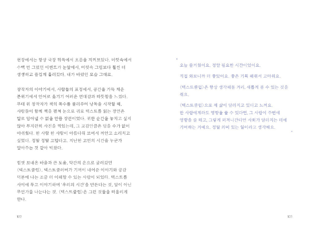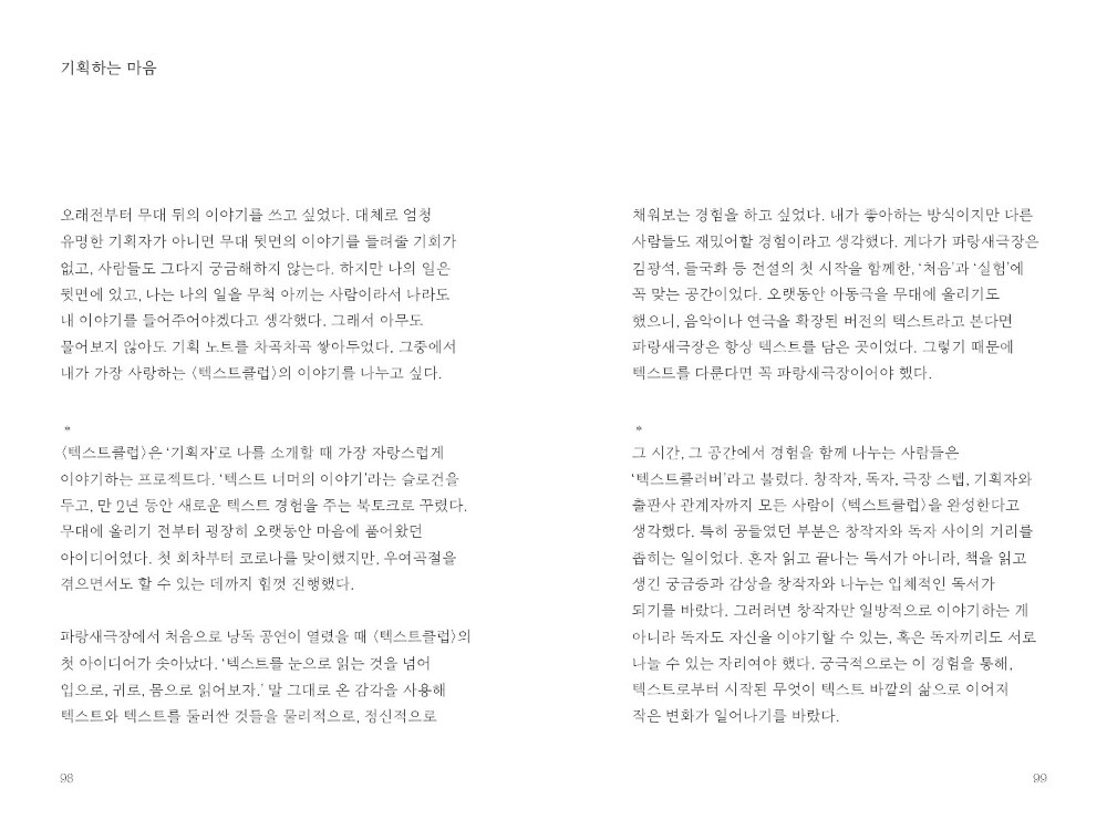 오래전부터 무대 뒤의 이야기를 쓰고 싶었다. 대체로 엄청 유명한 기획자가 아니면 무대 뒷면의 이야기를 들려줄 기회가 없고, 사람들도 그다지 궁금해하지 않는다. 하지만 나의 일은 뒷면에 있고, 나는 나의 일을 무척 아끼는 사람이라서 나라도 내 이야기를 들어주어야겠다고 생각했다. 그래서 아무도 물어보지 않아도 기획 노트를 차곡차곡 쌓아두었다. 그중에서 내가 가장 사랑하는 <텍스트클럽>의 이야기를 나누고 싶다.