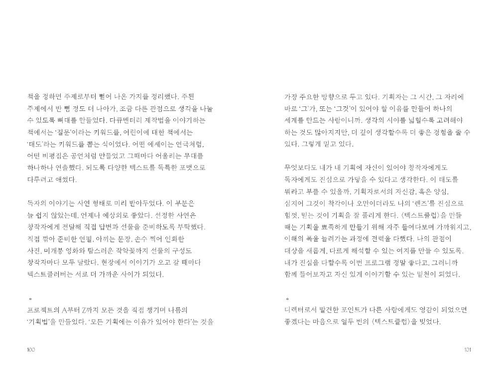 무엇보다도 내가 내 기획에 자신이 있어야 창작자에게도 독자에게도 진심으로 가닿을 수 있다고 생각한다. 이 태도를 뭐라고 부를 수 있을까. 기획자로서의 자신감, 혹은 양심, 심지어 그것이 착각이나 오만이더라도 나의 ‘렌즈’를 진심으로 힘껏, 믿는 것이 기획을 잘 풀리게 한다. <텍스트클럽>을 만들 때는 기획을 뾰족하게 만들기 위해 자주 들여다보며 가까워지고, 이해의 폭을 늘려가는 과정에 전력을 다했다. 나의 관점이 대상을 새롭게, 다르게 해석할 수 있는 여지를 만들 수 있도록. 내가 진심을 다할수록 이번 프로그램 정말 좋다고, 그러니까 함께 들어보자고 자신 있게 이야기할 수 있는 밑천이 되었다.