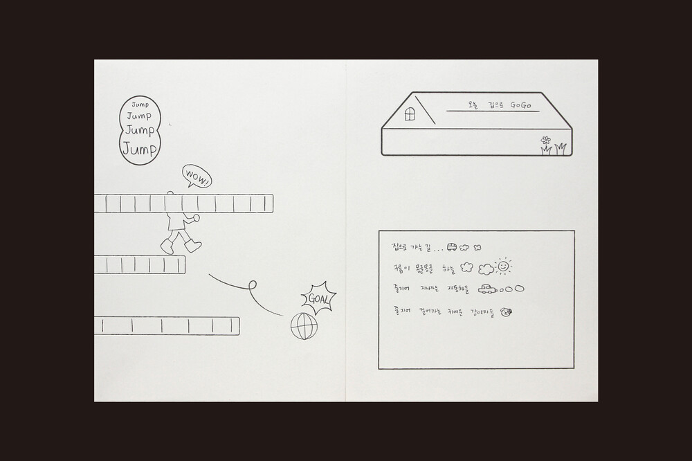 ‘드로잉’이라 하면 우리는 흔히 유명 작가의 밑그림이나 사실적인 소묘 작품을 떠올리며 그 범위를 제한해 생각합니다. 하지만 엉망 종이 워크북에서 정의하는 드로잉이란, ‘그리는 사람이 완성 여부를 오롯이 결정하며 주제나 재료 제한 없이 표현하는 그림’입니다. 밑그림처럼 보이기도 하고 색이 들어갈 수도 있고 글을 적어도 좋습니다. 저는 낙서, 작업, 작품, 그림 등을 모두 포괄하여 드로잉이라 부릅니다. 또한 그림이나 작품이라는 단어가 주는 중압감에서 벗어나자는 의미도 있습니다. 여기서 드로잉은 도화지 위에 그리는 그림뿐 아니라, 나뭇가지나 돌, 물로 땅에 그려 자연스럽게 사라지는 것들, 그리고 그때 주변의 날씨와 공기까지도 포함합니다. 어떠한 표현도 드로잉이 될 수 있습니다.