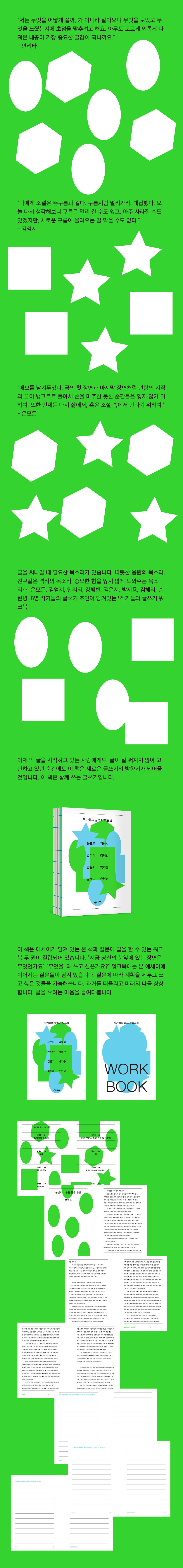 이 책은 에세이가 담겨 있는 본 책과 질문에 답을 할 수 있는 워크북 두 권이 결합되어 있습니다. “지금 당신의 눈앞에 있는 장면은 무엇인가요” “무엇을, 왜 쓰고 싶은가요?” 워크북에는 본 에세이에 이어지는 질문들이 담겨 있습니다. 질문에 따라 계획을 세우고 쓰고 싶은 것들을 가늠해 봅니다. 과거를 떠올리고 미래의 나를 상상합니다. 글을 쓰려는 마음을 들여다봅니다. 이제 막 글을 시작하고 있는 사람에게도, 글이 잘 써지지 않아 고민하고 있던 순간에도 이 책은 새로운 글쓰기의 방향키가 되어줄 것입니다. 이 책은 함께 쓰는 글쓰기입니다.