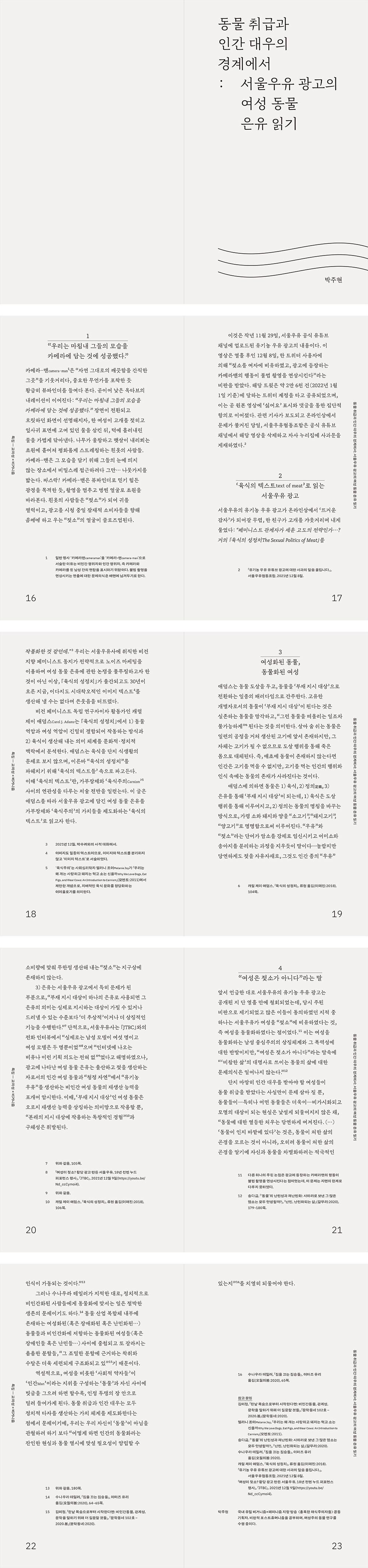 이슈 코너에서는 우희종 교수가 동물권위원회에 대한 이야기와 그 시의성을 다뤘고 김산하 작가가 비인간 동물의 정치를 주제로 글을 썼다.