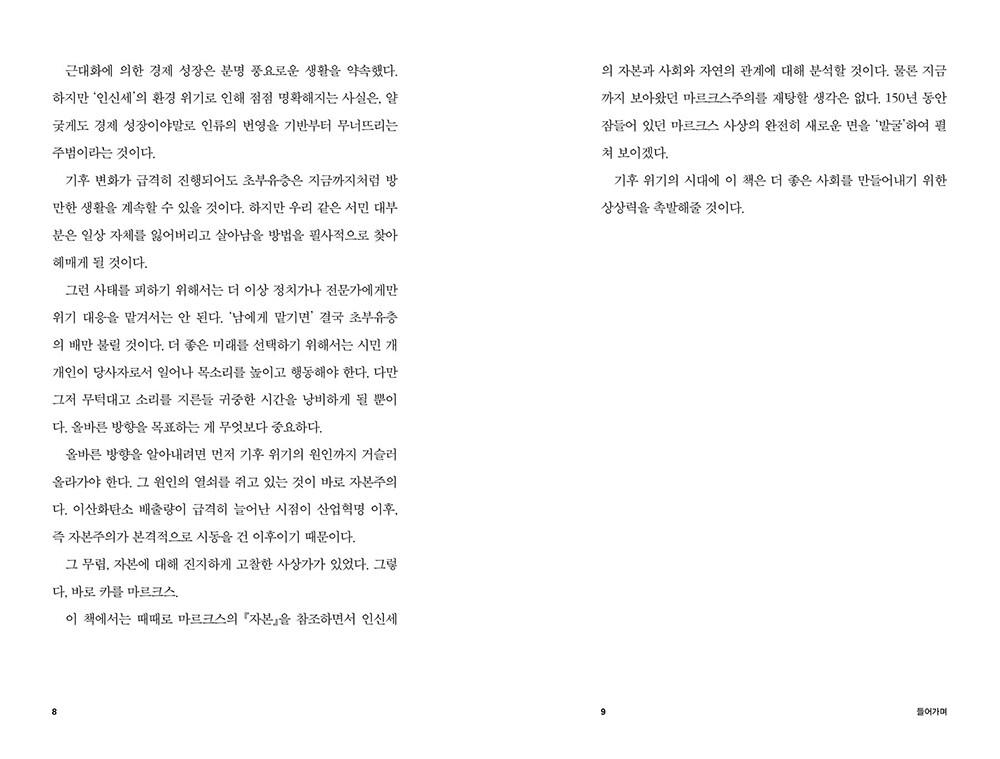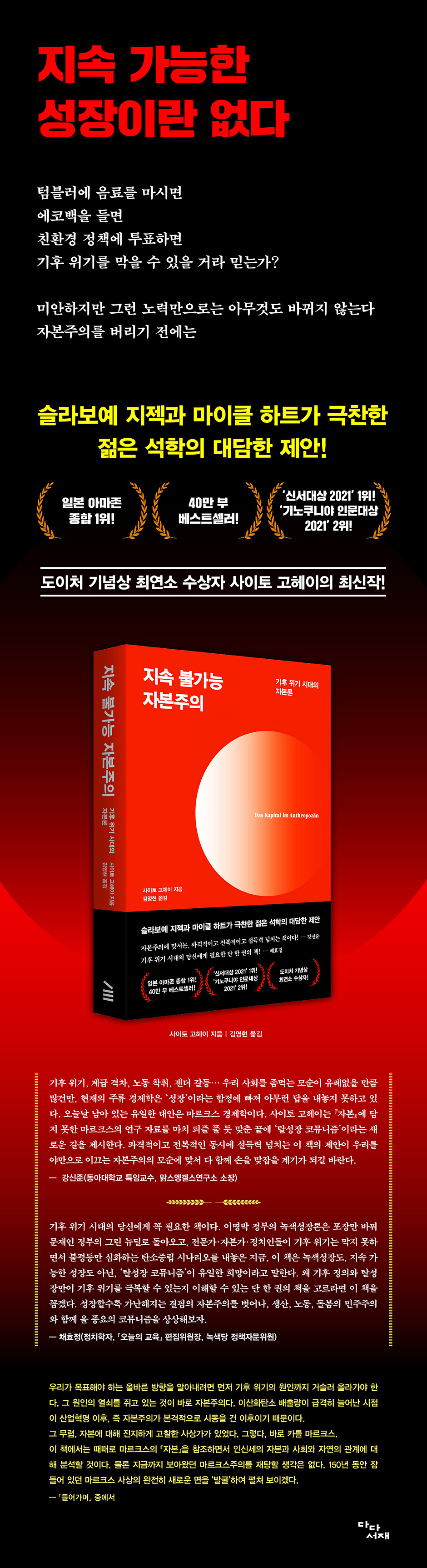 지난해 일본에서 출간되어 40만 부 이상 판매된 이 책은 일본의 청년층 사이에 탈성장과 마르크스 새로 알기 열풍을 일으키고 있다. 사이토 고헤이는 책 출간 후 일본에서 가장 뜨거운 지식인이 되어 각종 매체에서 자본주의와 기득권의 문제점을 통렬히 비판하며 대안을 제시하고 있다. 기후 위기뿐 아니라 세대 갈등, 계층 격차, 노동 착취, 경제 불황 등 여러 사회문제로 골머리를 앓고 있는 우리 사회에 이 책이 해결의 실마리가 될 수 있을 것이다.