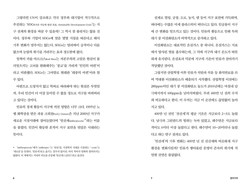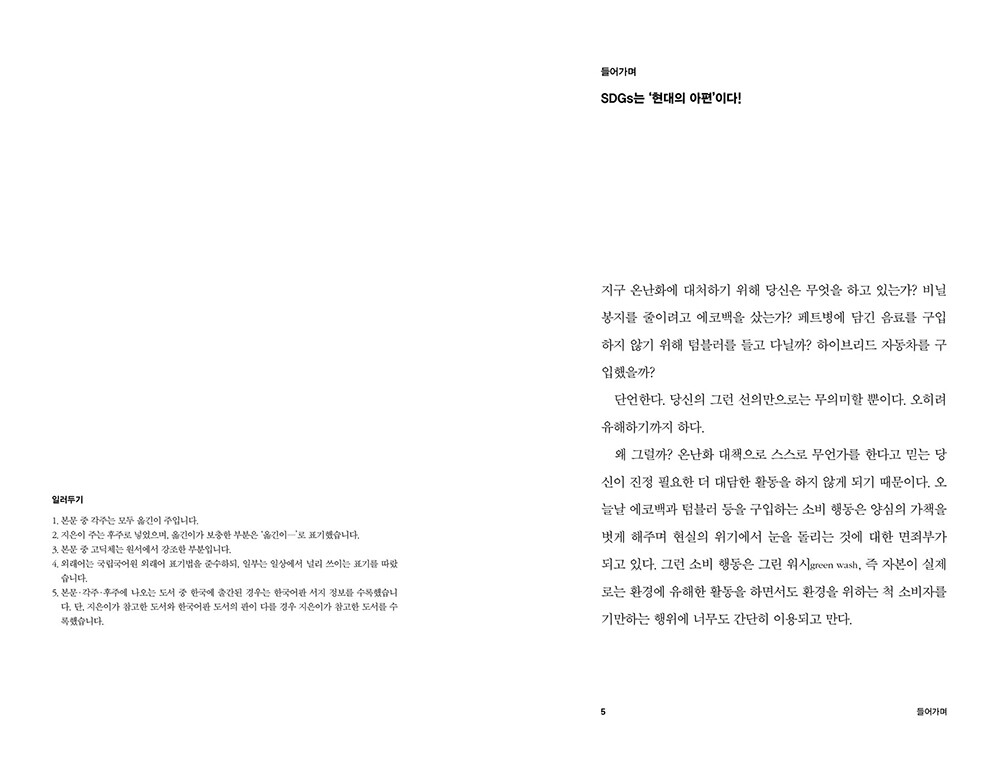 UN이 강조하고 각국 정부와 대기업이 적극적으로 추진하는 ‘SDGs(지속 가능한 발전 목표, Sustainable Development Goals)’는 지구 전체의 환경을 바꿀 수 있을까? 그 역시 잘 풀리지는 않을 것이다. 정부와 기업이 SDGs에 맞춘 몇몇 지침을 따른다고 해서 기후 변화가 멈추지는 않는다. SDGs는 알리바이 공작이나 다름없으며 눈앞의 위기를 가려주는 효과 정도밖에 없다.