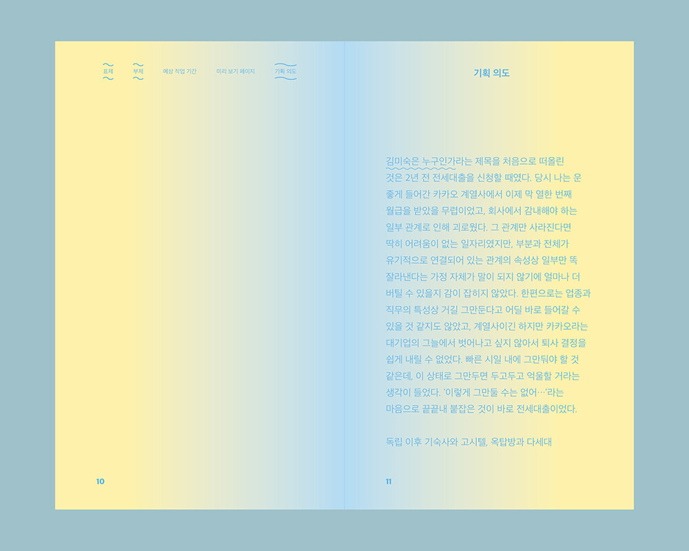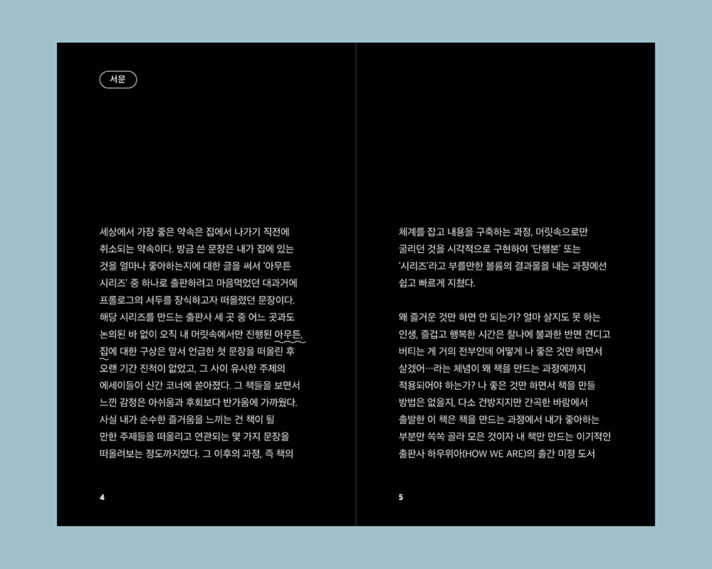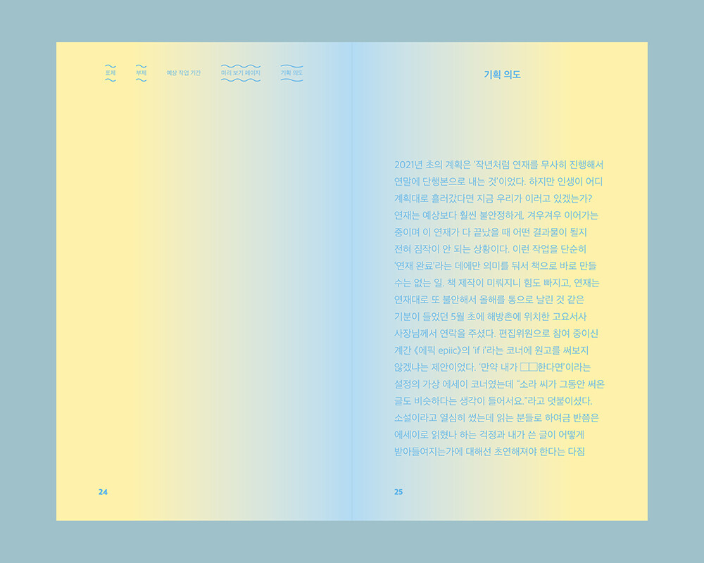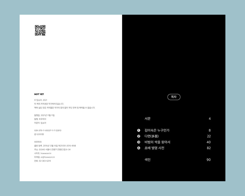 『NOT YET』은 아직 발행되지 않은 하우위아(HOW WE ARE)의 도서 목록을 미리 살펴볼 수 있는 카탈로그입니다. 책이 될 수 있는 이야깃거리를 차곡차곡 모아두는 마음으로 기획 단계에 잠깐 혹은 오래 머문 ‘출간 미정 도서’의 클라우드에서 덜 부끄럽고 제법 그럴싸한 것들을 엄선했습니다. 표제와 부제, 예상 목차와 작업 기간, 미리보기 페이지, 기획 의도 등 어디까지나 출간 예정보다는 미정에 가까운 도서들의 면면을 소개합니다. 만약 카탈로그에 포함된 도서가 추후 발행된다면 기획안과 결과물의 비교를 통해 제작 과정의 난관과 뜻밖의 묘수를 엿볼 수 있을 것이며, 추후 발행되지 않는다면 더는 하고 싶지 않아진 이야기와 그 이유를 유추하는 데에 유의미한 참고 자료가 될 수 있을 것입니다.