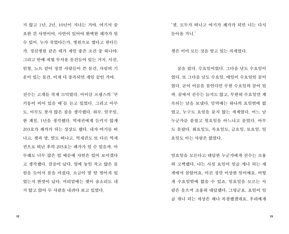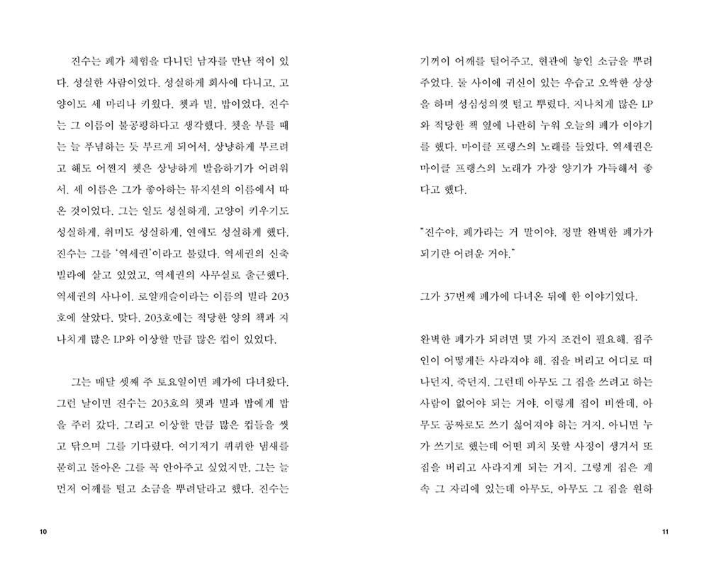 완벽한 폐가가 되려면 몇 가지 조건이 필요해. 집주인이 어떻게든 사라져야 해. 집을 버리고 어디로 떠나던지, 죽던지. 그런데 아무도 그 집을 쓰려고 하는 사람이 없어야 되는 거야. (p.11)