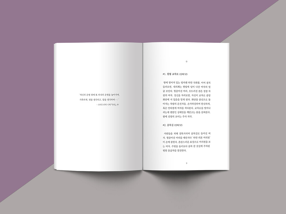 첫 번째 단편 <회색>은 '실패한 소설가와 소설 속 인물이 어긋나는 세계 안에서 서로의 사랑을 확인하는 이야기'로 스토리를 맞춰가며 상황을 유추하는 미스테리 멜로물입니다.