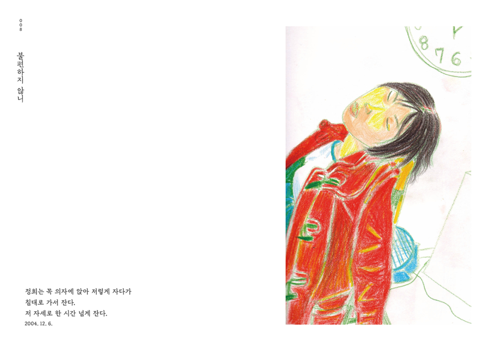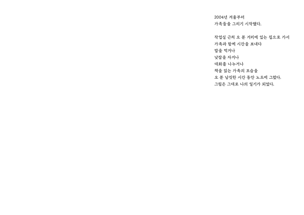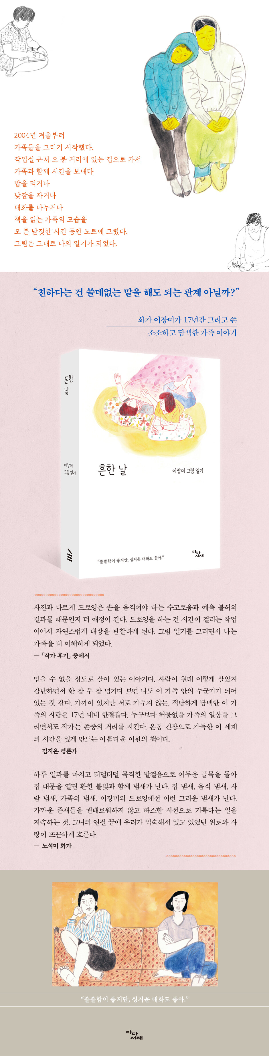 매일 아침 6시 반에 모여 아침을 함께 먹고 각자의 학교와 일터로 흩어졌다가 저녁에는 따뜻한 담요 아래 옹기종기 모여 고단했던 하루를 다독이는 가족. 이장미 화가는 작업실에서 5분 거리인 집으로 가 이 가족의 평범한 모습을 손에 잡히는 대로 펜이나 연필을 들어 노트에 그려낸다. 한 장의 그림에 짧은 글 몇 줄로 이루어진 이 소박한 일기는 17년이라는 긴 세월 동안 어린 조카가 어른이 되어가고 엄마와 아버지, 언니와 동생이 조금씩 나이 들어가는 과정을 차곡차곡 담고 있다.