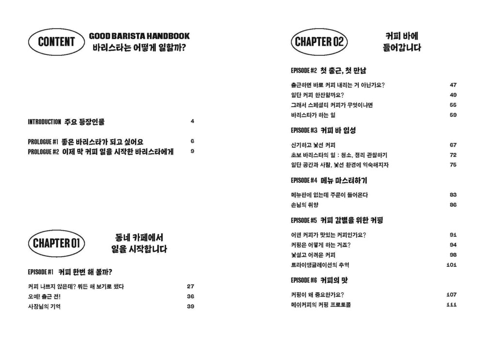 반복되는 일상 속에서도 크고 작은 행복과 위안을 발견하며 인생을 살아가는 것처럼, 커피를 만드는 일도 마찬가지다. 먹고사는 일에 치여 때때로 목적성을 잃거나 회의감에 빠질 때가 있지만 ‘매 순간 행복하진 않아도 커피를 하면서 행복한 순간이 있어 포기할 수 없는 것’이 바리스타의 삶이다. 이 책에서는 커피를 추출하는 기술부터 손님과 대화하는 노하우, 커피 문화를 만들어가는 방식까지 총망라하며 바리스타로 살아가며 터득해야 할 기능적인 업무부터 늘 새겨야 할 마음가짐이 무엇인지 전한다.