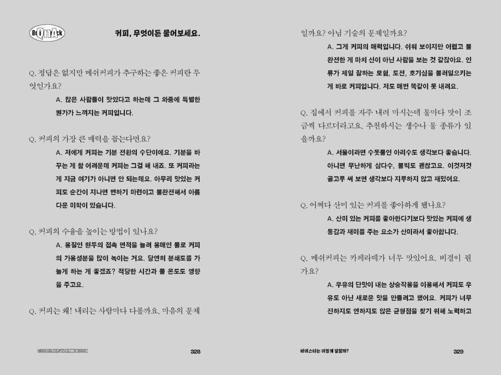 첫 시작은 단순했어요. 저희는 동네에서 함께 좋은 커피를 마시는 문화를 만들고 싶었어요. 커피를 잘 내리고 잘 팔겠다는 개인의 목표보다는 사람과 사람이 모여 이루는 문화가 되면 좋겠다는 욕망이 있었죠. 친구나 가족들에게 좋은 것을 주고 싶은 마음으로 제일 좋은 재료를 찾아다니고 새로운 기술을 연구하고 반영하는 것도 다 그런 이유에서에요. -51p