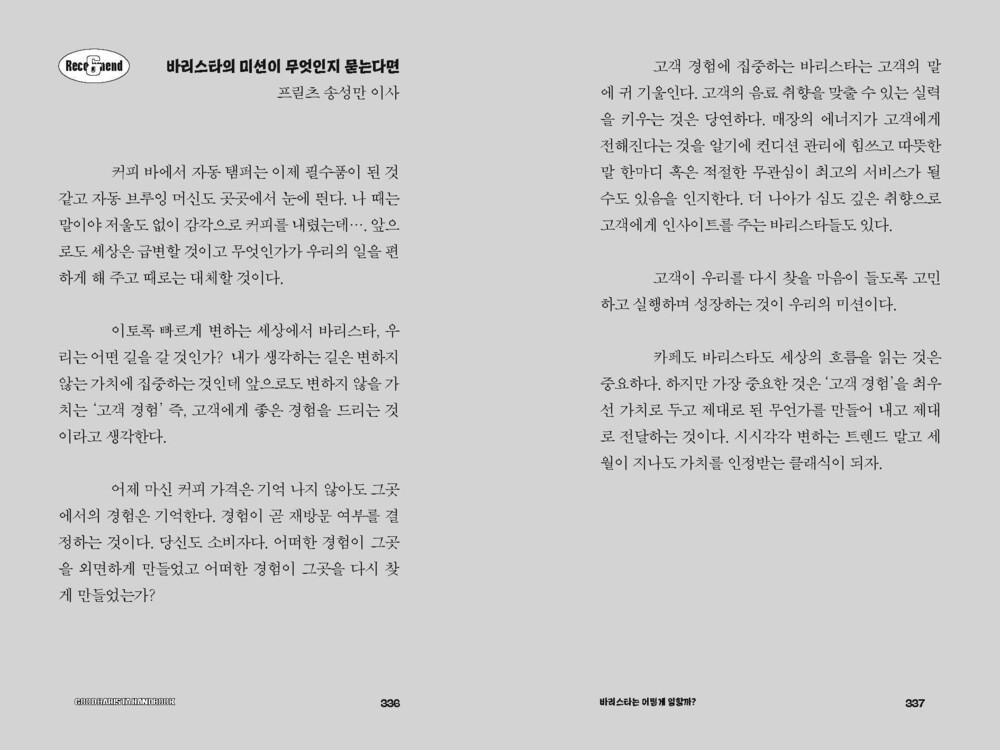 고객이 우리를 다시 찾을 마음이 들도록 고민하고 실행하며 성장하는 것이 바리스타의 미션이다. 카페도 바리스타도 세상의 흐름을 읽는 것은 중요하다. 하지만 가장 중요한 것은 ‘고객 경험’을 최우선 가치로 두고 제대로 된 무언가를 만들어 내고 제대로 전달하는 것이다. 시시각각 변하는 트렌드 말고 세월이 지나도 가치를 인정받는 클래식이 되자. -추천사(프릳츠 송성만 이사)