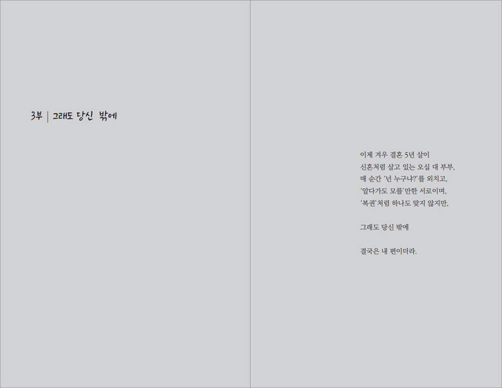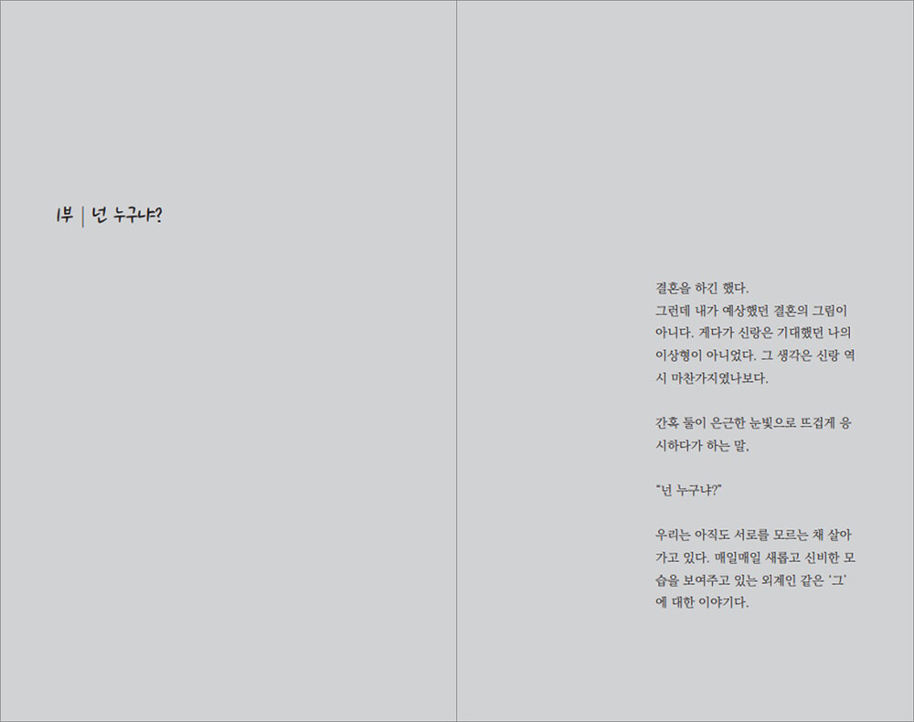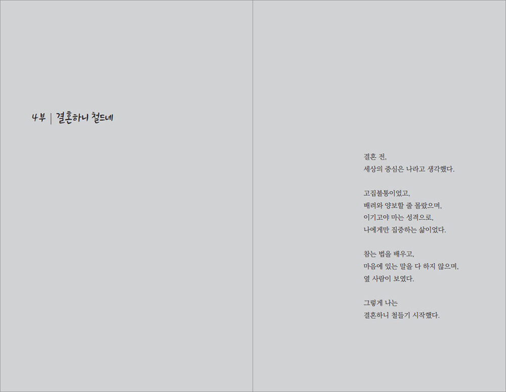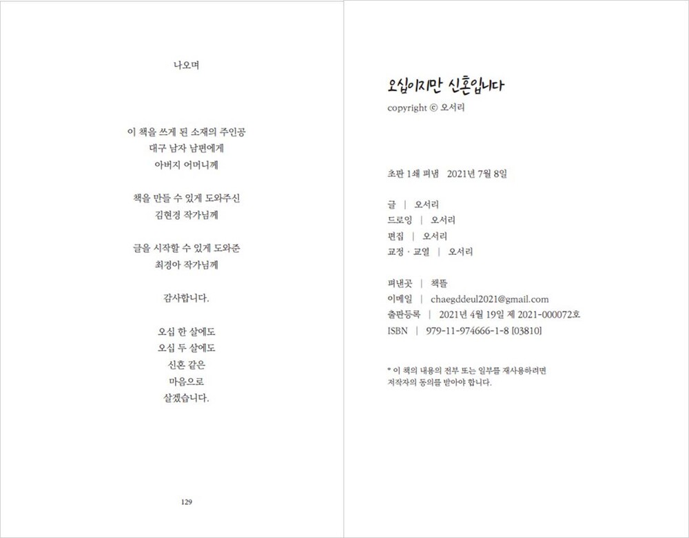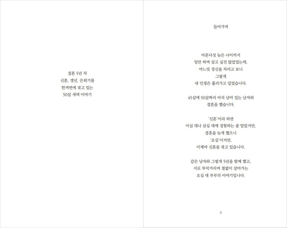 마흔다섯 늦은 나이까지 일만 하며 살고 싶진 않았었는데, 어느덧 정신을 차리고 보니 그렇게 내 인생은 흘러가고 있었습니다. 45 살에 50 살짜리 아직 남아 있는 남자와 결혼을 했습니다. ‘신혼’이라 하면 이십 대나 삼십 대에 경험하는 줄 알았지만, 결혼을 늦게 했으니 ‘오십’이지만, 이제야 신혼을 겪고 있습니다. 같은 남자와 그렇게 5 년을 함께 했고, 서로 투덕거리며 철없이 살아가는 오십 대 부부의 이야기입니다.