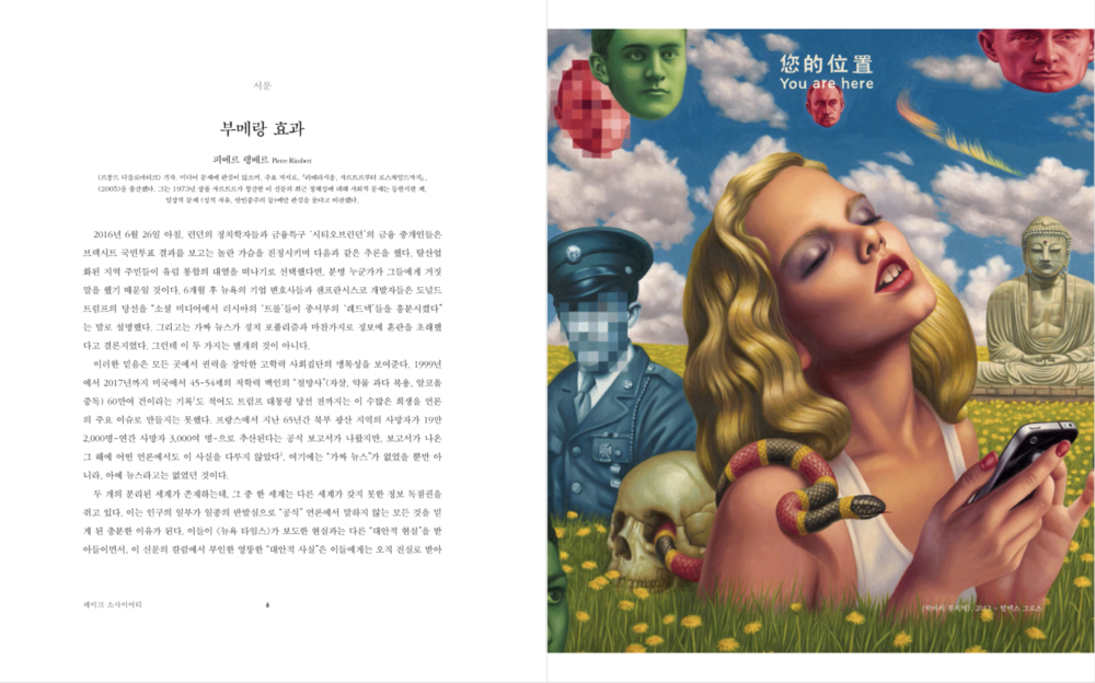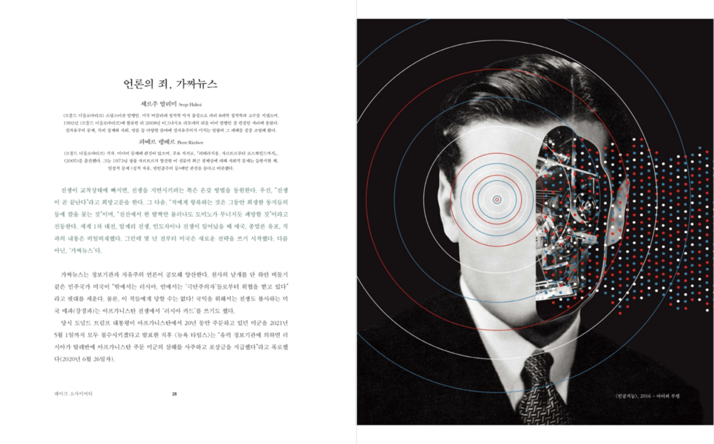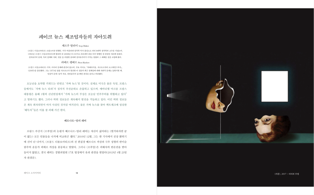 『마니에르 드 부아르』가 6번째로 펴내는 「페이크 소사이어티」는 모두 4부, 24편의 글로 이뤄집니다. 잡지는 포퓰리즘과 거짓정보가 판치는 세계 언론 실태를 흥미로운 이야기들로 풀어나갑니다. 또 이런 현실 속 세계가, 그리고 한국이 나아갈 길을 엿봅니다.