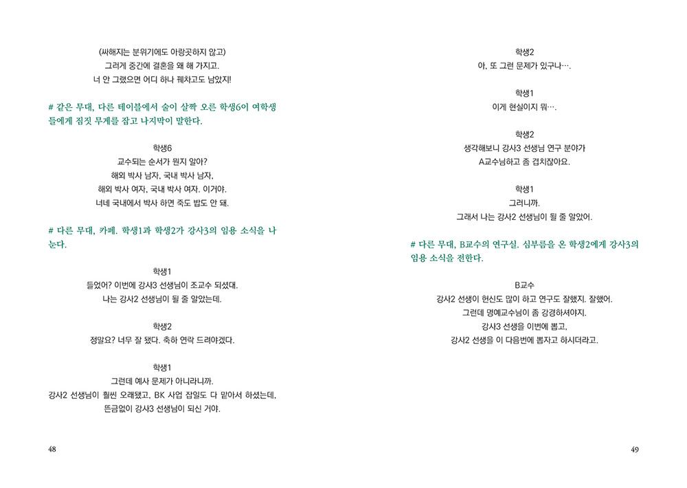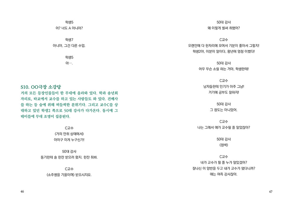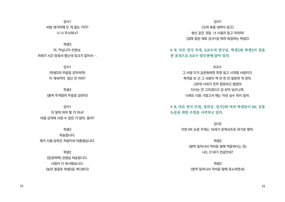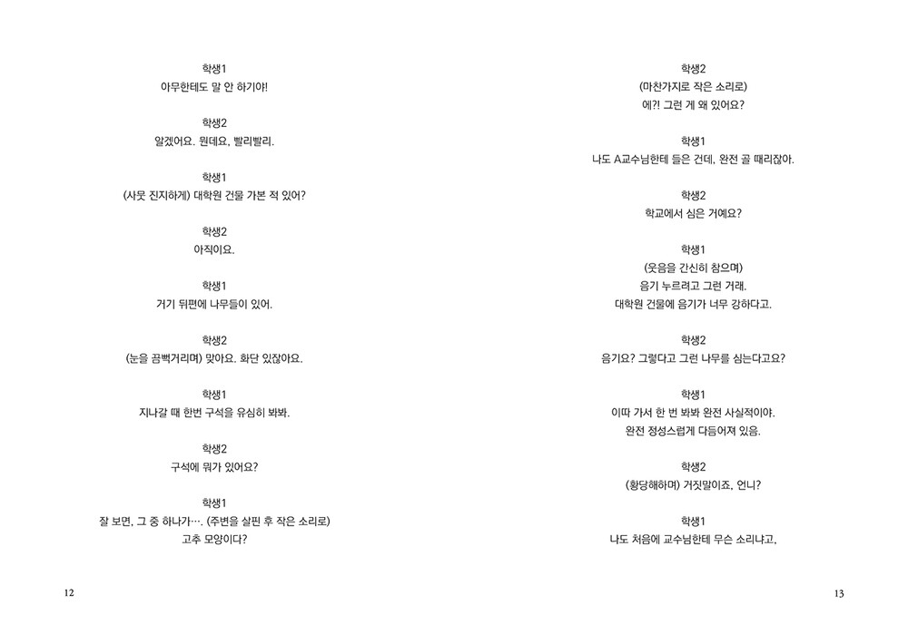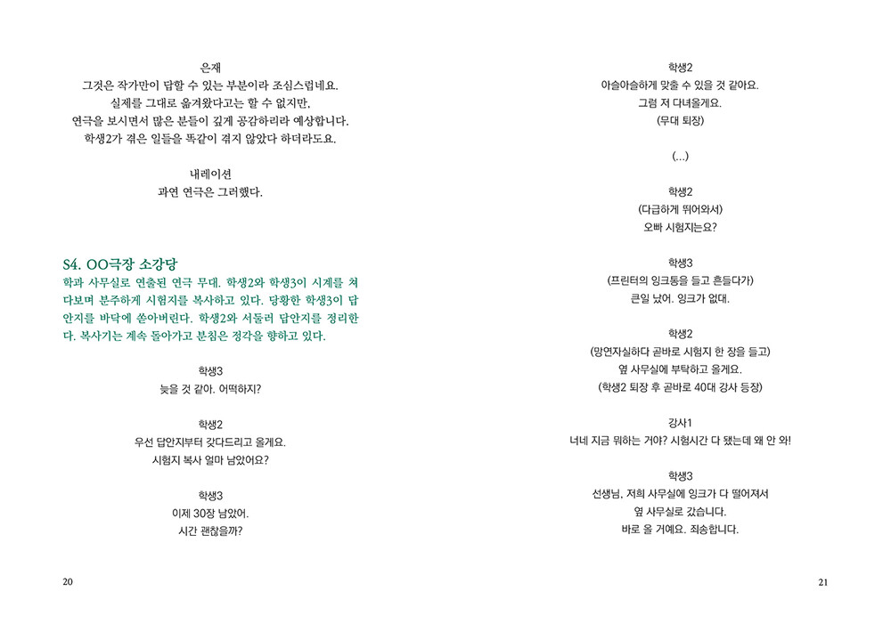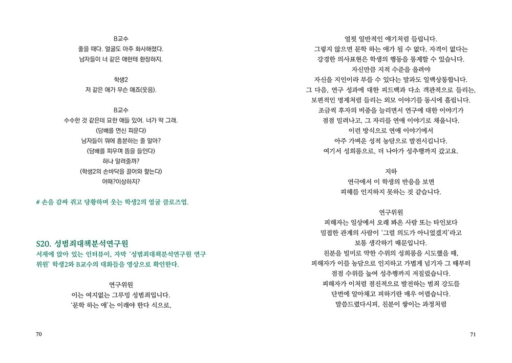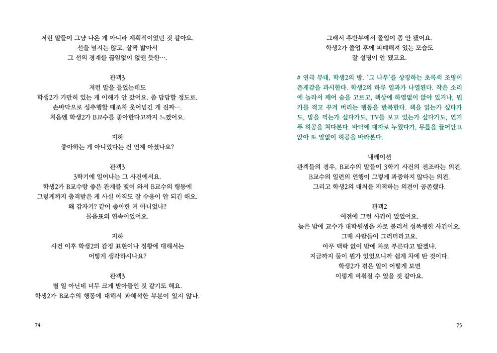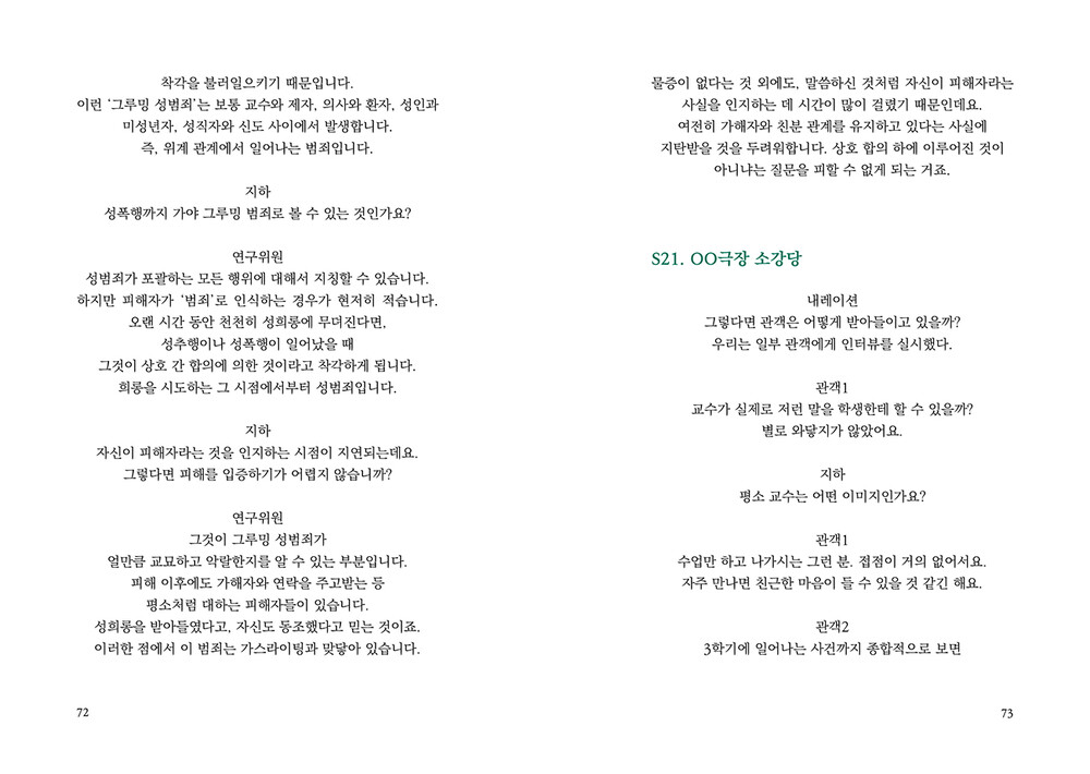 “누군가는 ‘뉴스에서만 보던 일’이라고 생각하며나와 내 주변에서는 일어나지 않을 거라 여기는일들이 있다. 내게 일어날 거라 상상도 하지 못했던일들이 있다. 그 무방비함에 책임이 전가되는 일을나와 학생2와 아라가 겪었다. 그러나 진정으로책임을 져야 하는 이들은 우리가 아니다.”