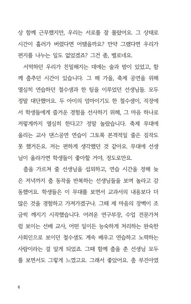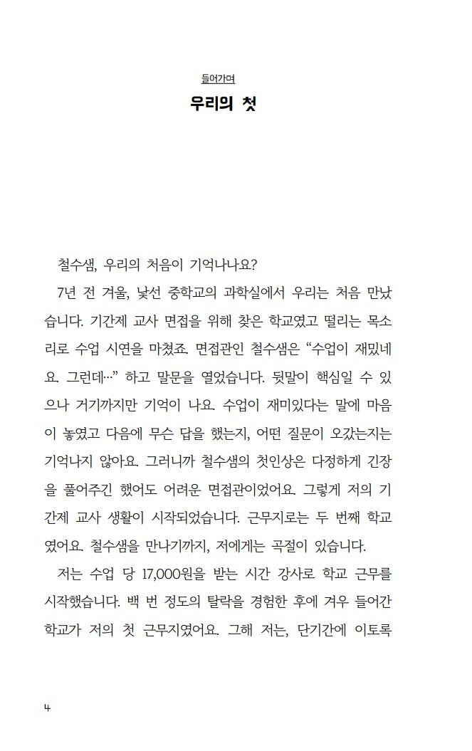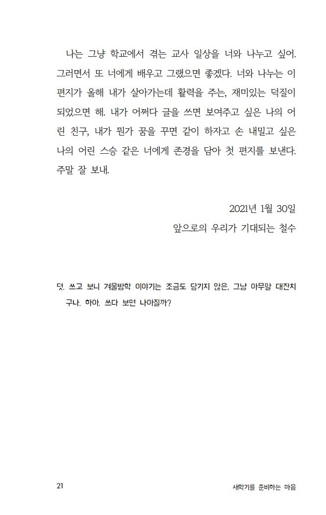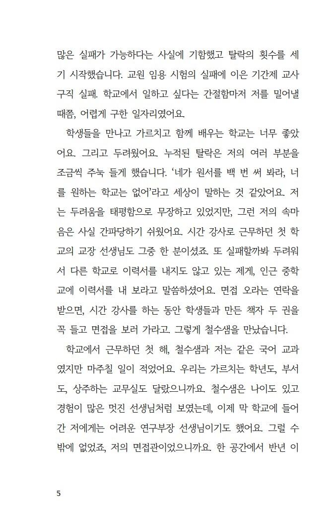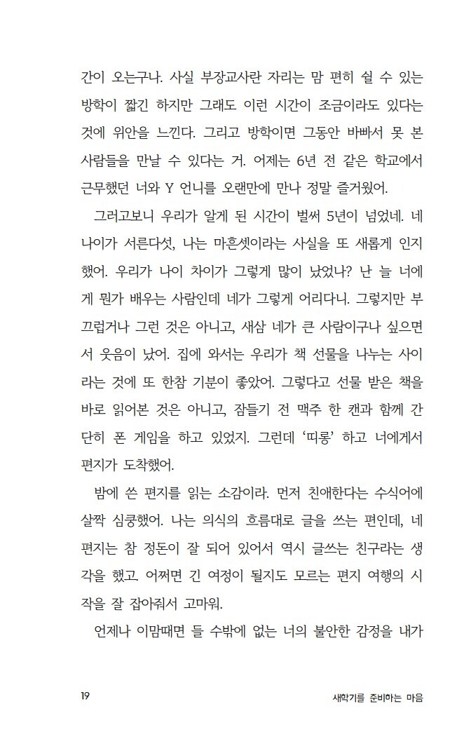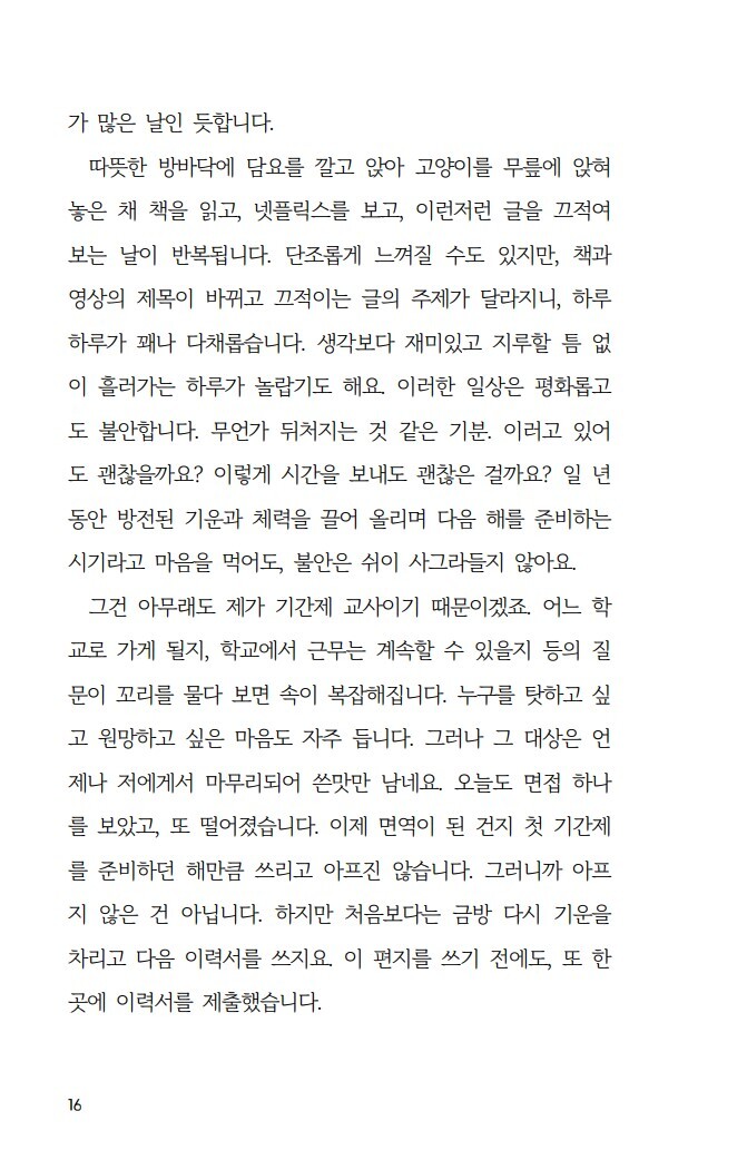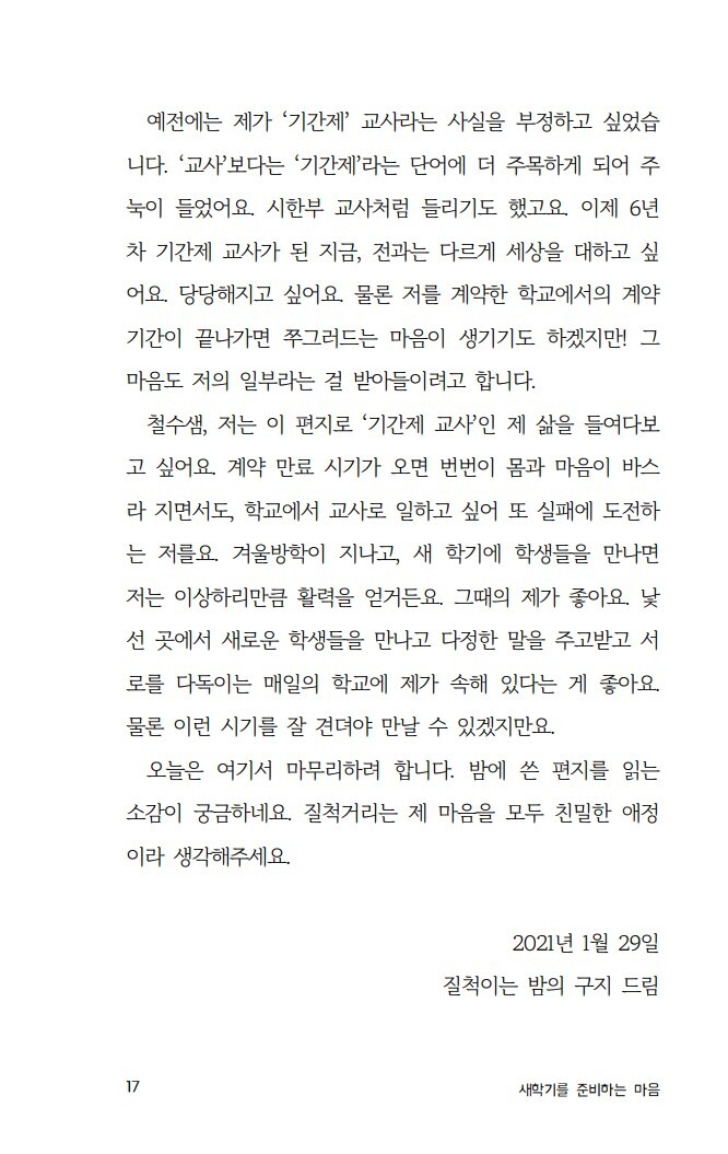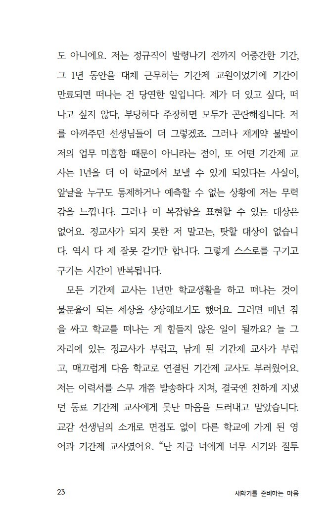 저는 이 편지로 ‘기간제 교사’인 제 삶을 들여다보고 싶어요. 계약 만료 시기가 오면 번번이 몸과 마음이 바스라 지면서도, 학교에서 교사로 일하고 싶어 또 실패에 도전하는 저를요. 겨울방학이 지나고, 새 학기에 학생들을 만나면 저는 이상하리만큼 활력을 얻거든요. 그때의 제가 좋아요. 낯선 곳에서 새로운 학생들을 만나고 다정한 말을 주고받고 서로를 다독이는 매일의 학교에 제가 속해 있다는 게 좋아요. 물론 이런 시기를 잘 견뎌야 만날 수 있겠지만요.