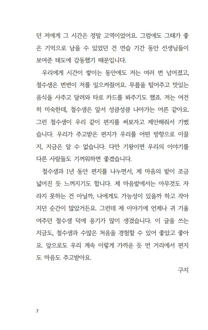 '친애하는 철수샘'으로 시작되는 구지의 편지를 읽고 지금껏 내 곁을 스쳐지나간 많은 기간제 교사들을 떠올렸다. 누구보다 열심히 학교 생활을 하였으나 일정 시간이 지나면 금세 떠나야 했던, 누군가를 대신해 존재해야 했던 교사들. 기간제 교사 구지는 학교에서의 자신이 '시한부 교사'인 것 같다고 느끼면서도 매일 아이들과 넘치는 사랑을 주고 받는다. 오월의 태양 아래 아이들과 함께 무럭무럭 큰다. 그런 구지를 따뜻한 눈으로 바라보고 응원하는 철수가 있다. 너는 기간제이지만 18년차 정교사인 나보다 훨씬 나은 교사라고, 무한한 지지와 사랑을 보낸다. 매일 망하다가 가끔 성공하는 국어 수업, 태양보다 빛나는 아이들이라는 존재, 평등해보이면서도 기우뚱한 학교, 그리고 그 안에 싹트는 우정이 책에 촘촘히 박혀 있다. 불안하고 피곤한 세상 속에서 우리를 지탱해주는 건 결국 서로의 존재라는 걸, 구지와 철수가 나눈 1년의 편지를 읽으며 다시 배운다. 사이를 넘나드는 너머의 우정이다.