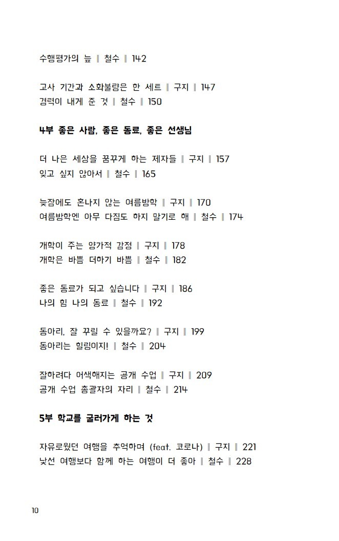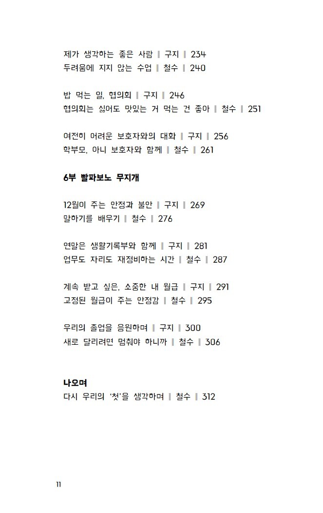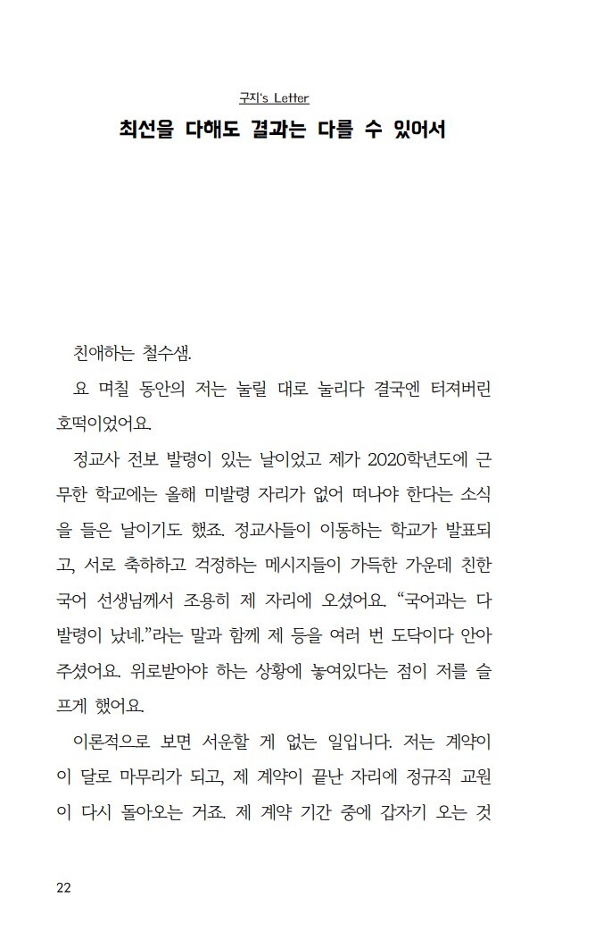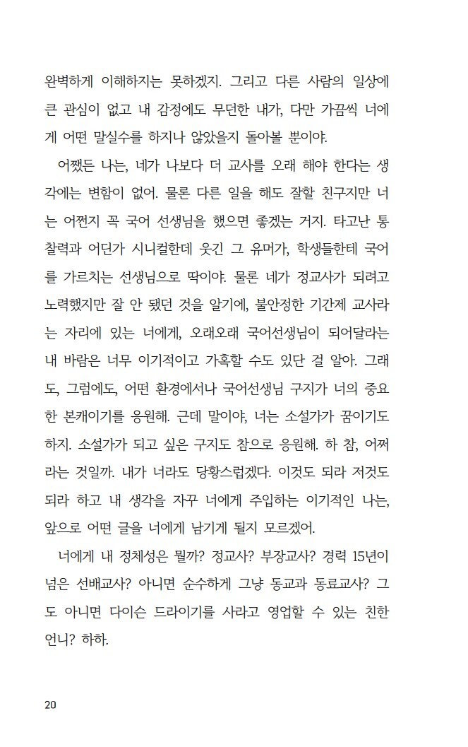 부장교사로서 느끼는 학교 생활의 모든 것이 네가 겪는 것과는 많이 다르겠지. 네게는 사치스러운 고민이라고 생각될 수도 있겠고. 그렇지만 나는 편하게 쓸래. 내가 아는 구지는 이런 걸 털어놓아도 나를 좋은 동료로 생각해 줄, 진짜 괜찮은 동료니까.