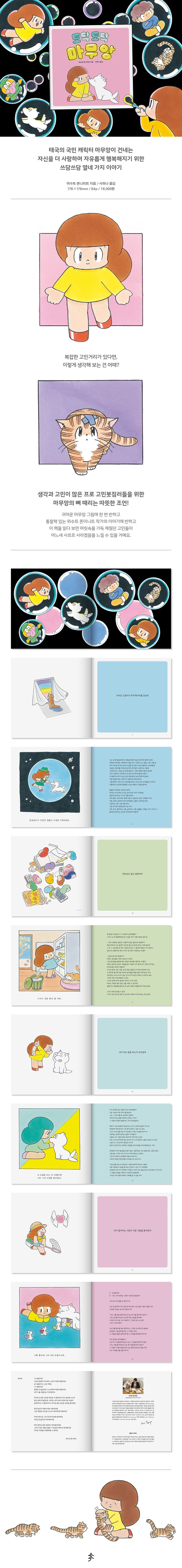『토닥토닥 마무앙』의 시작하는 글에서 위수트 폰니미트는 힘든 상황에서는 작은 고민도 크게 느껴지는 법이라면서 그럴 때 우리는 도와달라고 하고 도와주면서 함께 자유롭고 행복하게 살아가자고 말한다. 그렇게 손을 내밀며 마음을 다독이고 쓰다듬어 주는 마무앙식 자유와 행복을 따라가다 보면 조금 더 나답고 자유롭고 살아갈 힘과 용기를 얻을 수 있을 것이다.