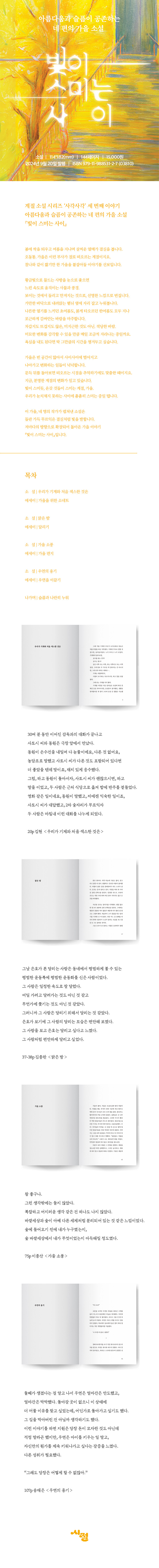 이 가을, 네 명의 작가가 펼쳐낸 소설은 들판 가득 무르익은 결실처럼 빛을 발합니다. 저마다의 방향으로 확장되어 돌아온 가을 이야기 『빛이 스미는 사이』입니다.