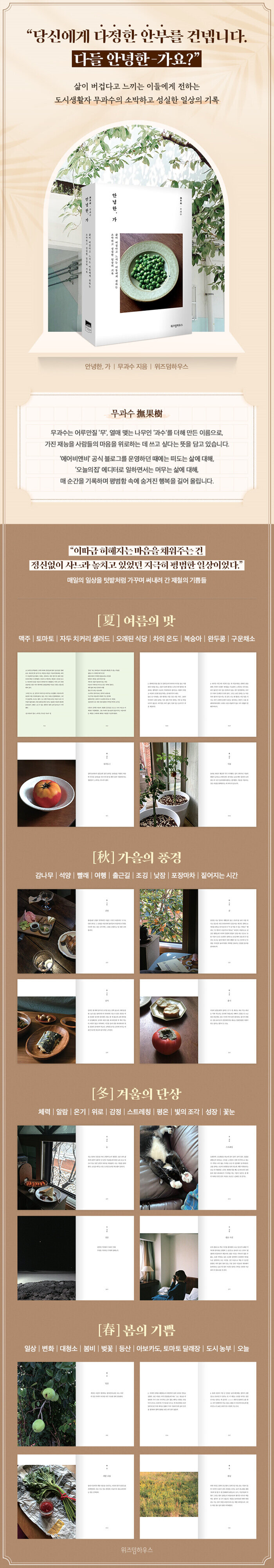 집 안 혹은 집 밖의 풍경을 기록하고 일상에 영감을 주는 콘텐츠로 대중에게 ‘집의 위로’를 선사하는 에디터 무과수의 에세이. 의미 있다고 생각하는 생활의 면면을 포착해 만든 《안녕한, 가》는 사계절 플레이리스트처럼 여름, 가을, 겨울, 봄의 순서로 구성되어 있다. 소박하지만 단단한 생활력이 느껴지는 글과 사진을 통해 삶이 버겁다고 느끼는 이들에게 뜻밖의 위안을 전한다. 이상과 일상을 분리하지 않고 매순간을 소중하게 생각하며, 성실하게 쌓아 올린 ‘하루’의 힘을 믿는 그의 기록은 도시 생활자를 위한 진정한 ‘일상의 기술’이다.