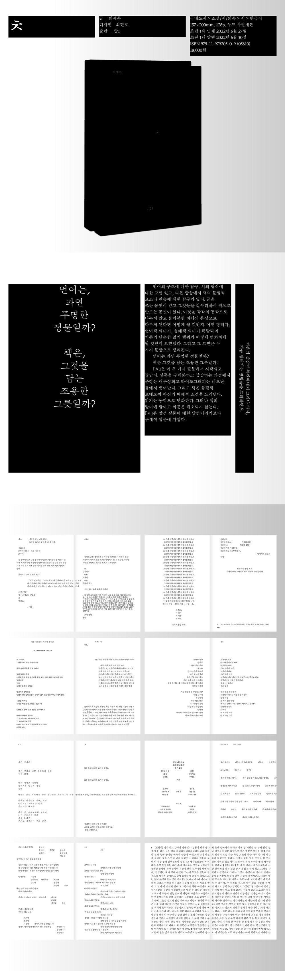 『ㅊ』은 이 두 가지 질문에서 시작되고 끝난다. 질문을 구체화하고 상상하는 과정에서 문장은 재구성되고 타이포그래피는 네모난 틀에서 벗어난다. 그리고 책은 물질적 토대로써 자신의 매체적 조건을 드러낸다. 읽기는 동적으로 변화한다. 그러나 책의 말미에 달아도 의문은 해소되지 않는다. 『ㅊ』은 앞선 질문에 대한 답변이라기보다 구체적 질문에 가깝다.