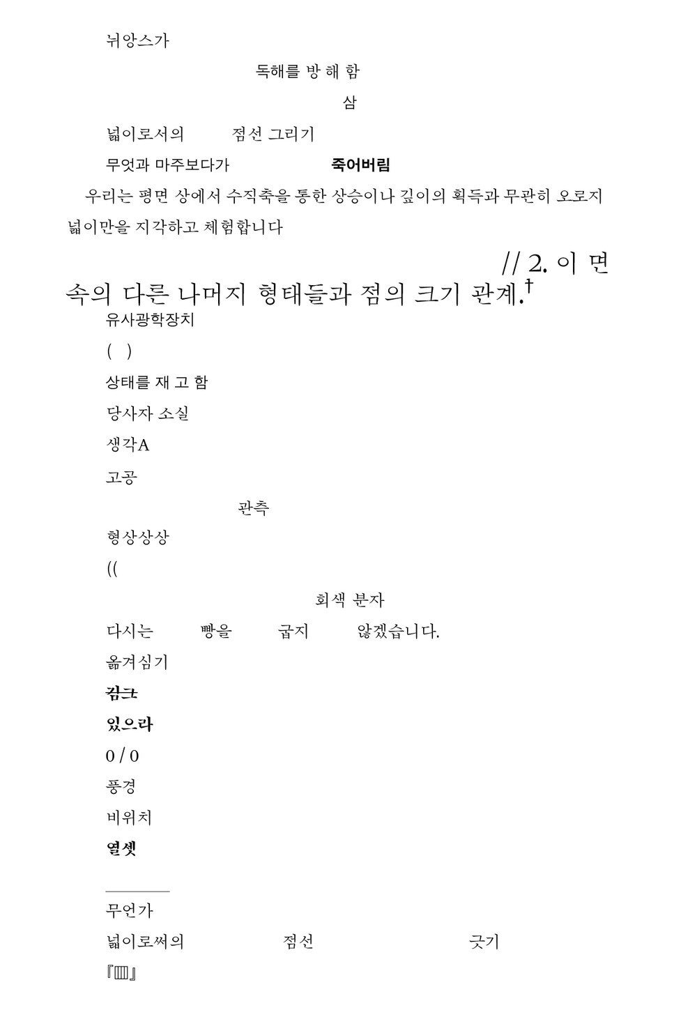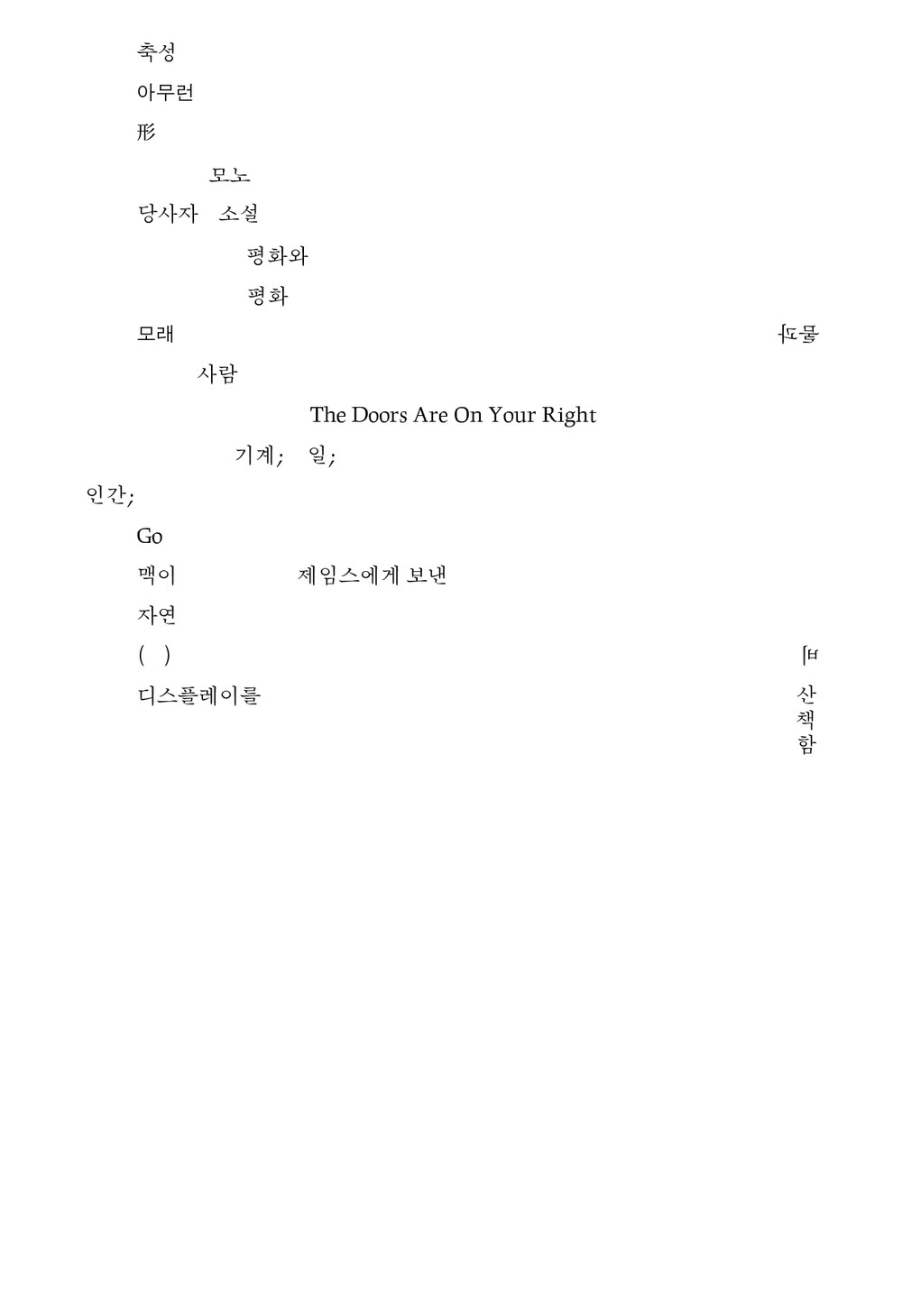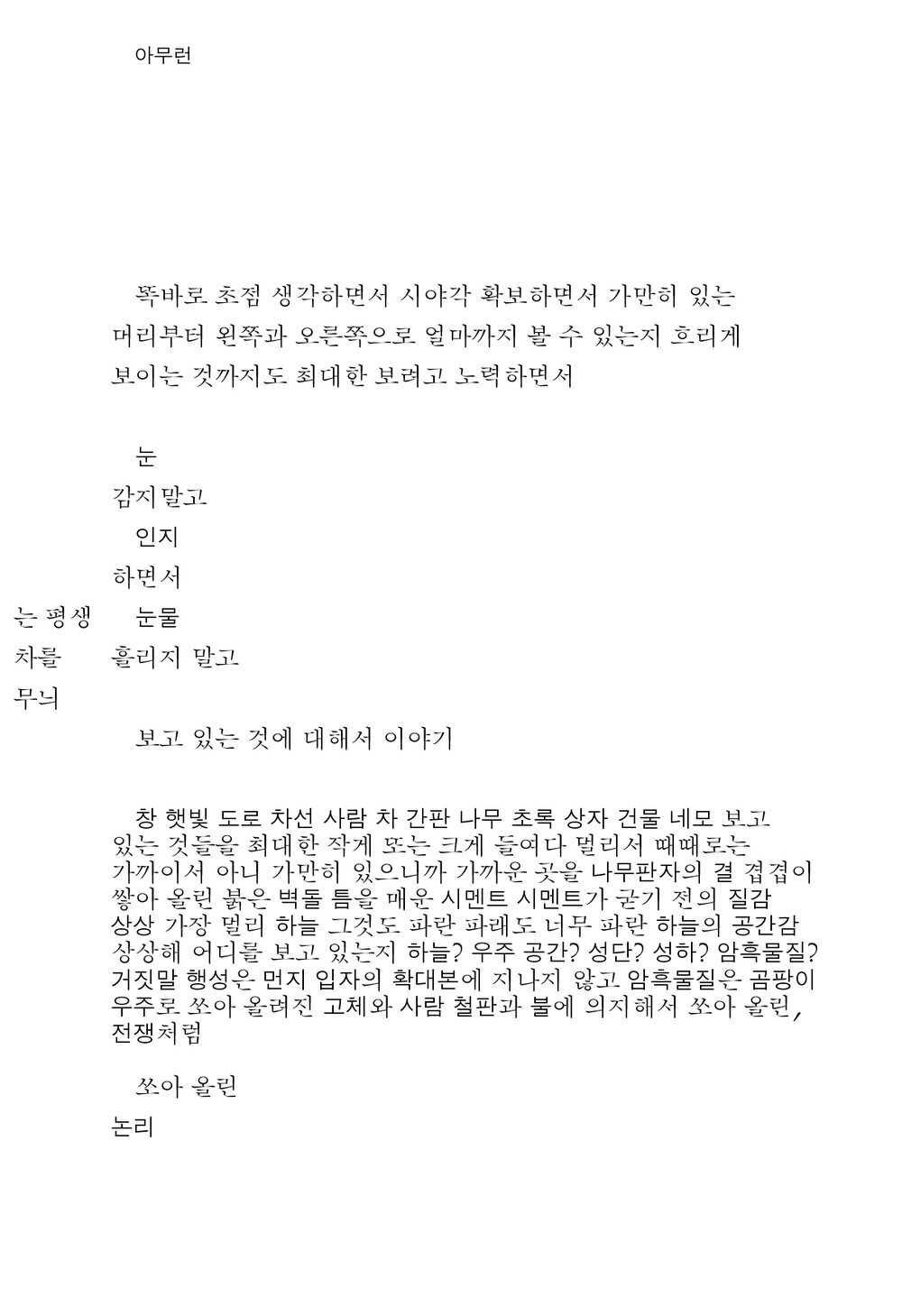 ▥이다 좀 가져와 액자에 넣을 그림이 필요해 좀 빌려줘 편지 쓸 일이 생겼어, 의 ▥ ▥의 ▥ 이다 ▥과 ▥이다 읽을 수 있다 읽지 않을 수 있다 네모인 ▥, 옆면이 우 우 한, 책장에 넣는다. 낯설게 만들어보자 연달아 말한다 거울 앞에 세워둔다 그것이 너는 누구니? 스스로 물을 때까지 기다린다 읽으면 똑똑해지나 아니요 ▥은 잃는 것입니다 스테이플러 잘깍, 잘깍 잃습니다 잊는다 테이블이 필요해 생각을 한다 원하는 테이블을 ▥에게 묻는다, 다리 긴 테이블 주문한다 어느 의자와도 짝이 될 수 있는 테이블 그 위에 ▥을 뒤집어 놓는다 테이블과 ▥ 짝처럼 보이게 ▥을 테이블의 밑에 던진다 ▥과 테이블이 짝처럼 ▥ 읽는 사람이 ▥ 위에 엎어져 잔다 ▥의 꿈을 꾼다 ▥을 얼굴에 얹고 잔다 ▥이 꿈을 꾼다 ▥의 짝이거나 ▥이 짝이거나 짝과 짝이거나 앞장이 뒷장의 밑에서 사이가 좋다 뒷장이 앞장의 내용을 예상 표절했다 정교하게, 책