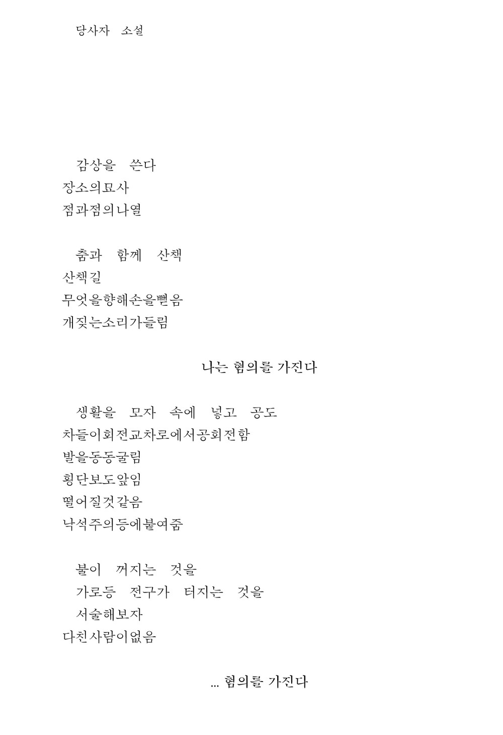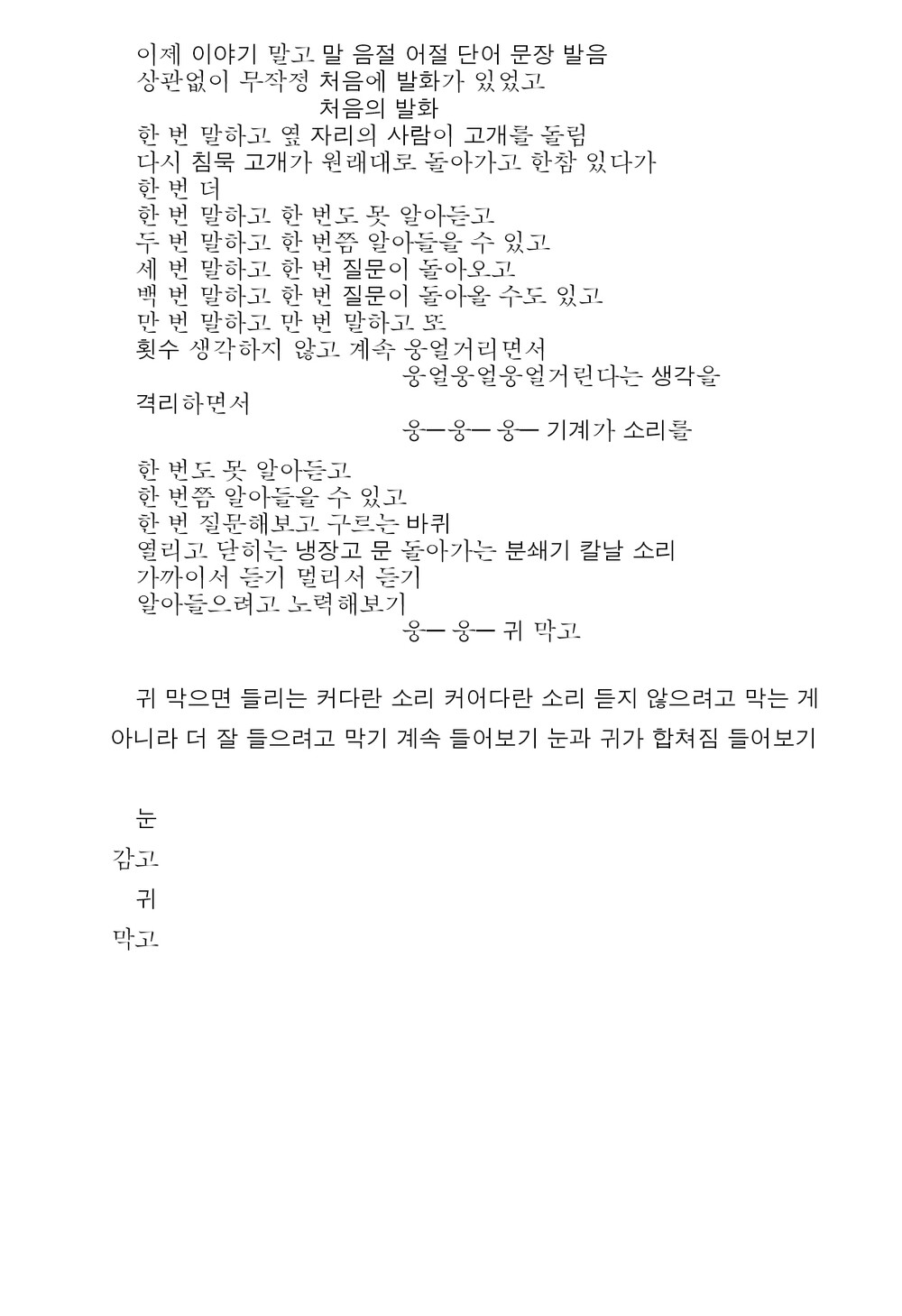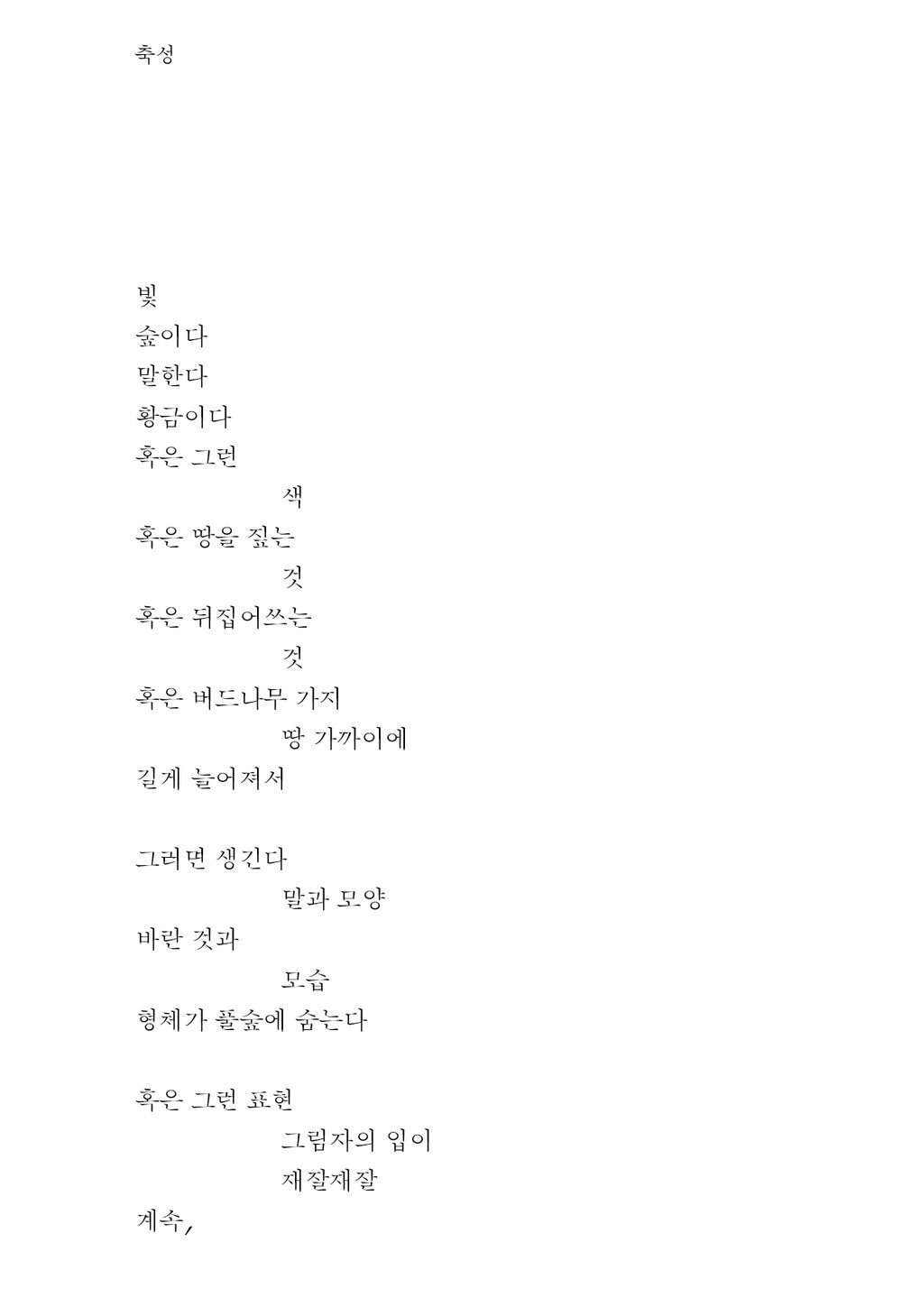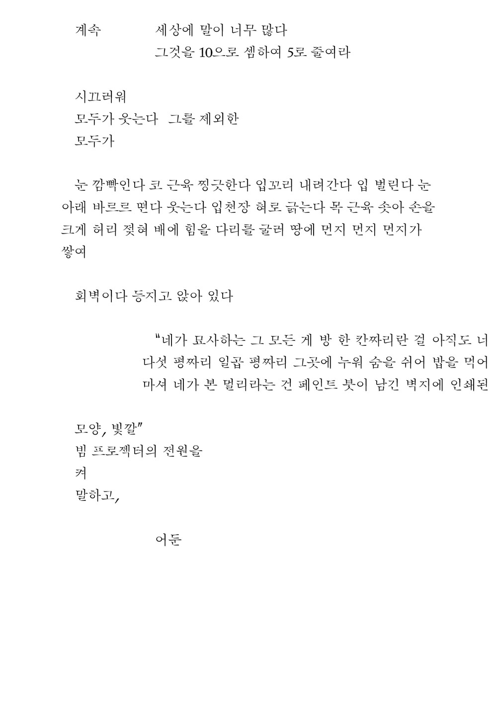 언어의 구조에 대한 탐구, 시의 형식에 대한 고민 있고, 다른 방향에서 책의 물질적 요소나 관습에 대한 탐구가 있다. 글을 쓰는 몸짓이 있고 그것들을 갈무리하여 책으로 만드는 몸짓이 있다. 이것들을 각각의 동작으로 나누지 않고 불가분한 하나의 몸짓으로 다루게 된다면 어떻게 될 것인지. 어떤 형태가, 언어적 의미가, 형태적 의미가 촉발되며 기존의 단순한 읽기 행위가 어떻게 변화하게될 것인지 고민했다. 그리고 그 고민은 두 가지 문장으로 정리된다.