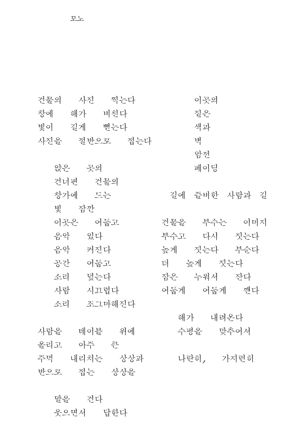 오래된 믿음이 있다. 문학 작품의 성취는 작품 세계관의 정합성, 핍진성의 정도나 서정적 자아의 보편성 내지는 특수성을 통해 결정된다 라는 식의, 믿음이 견고해지는 동안 책의 물질적 조건들은 주변부로 밀려났다. 내용을 온전히 담을수 있는 조용한 그릇. 책의 내용을 만드는 작가와 책의 꼴을 만드는 디자이너, 편집자는 각자의 테이블에 앉아서 서로를 향해 고갯짓 하지 않고, 손을 흔들어부른다거나 하지 않고 가만히 각자의 할 일을 해온듯 하다. 서로의 가능성에 대해 생각치 않고.