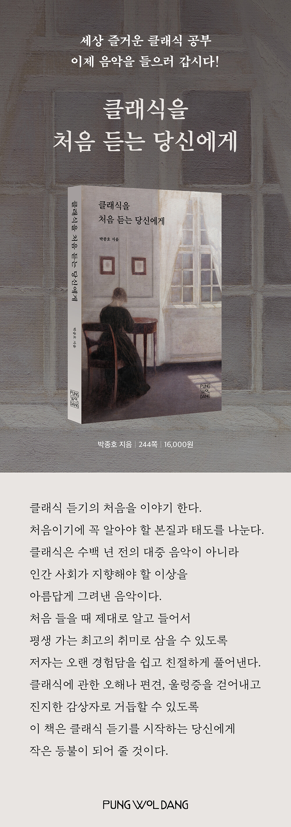 클래식에 관한 오해나 편견, 울렁증을 걷어내고 진지한 감상자로 거듭날 수 있도록 이 책은 클래식 듣기를 시작하는 당신에게 작은 등불이 되어줄 것이다.