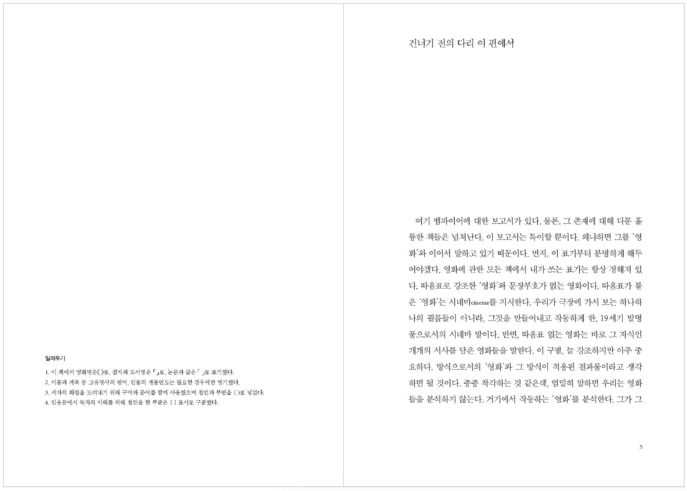 ‘영화’, 이렇게 말하면 어떨까, <이상한 나라의 앨리스>의 동굴은 차원 너머에 있지 않다. 언니와 늘 다니던 강둑의, 정장에 회중시계를 허리춤에 달고 있는 토끼를 따라가서 만나는 입구다. <오즈의 마법사>에서 도로시의 이상한 마법의 세계 역시 마찬가지이다. 캔자스의 회오리바람 안에 있는데, 몸이 한 발짝만 내밀어도 날리는 바람의 혀가 날카롭다. 그러니까 둘 다, 세상에 있으면서 세상에 보이지 않는 입구이다. 영화관도 마찬가지이다. 여느 건물과 전혀 다를 바가 없는데, 그 안에 들어가면 별세계가 펼쳐진다. 토끼나 여우, 누군가 바람을 잡고, 우리는 그에 끌려 어두컴컴한 방 안으로 들어간다. 이 책에서 언급한 영화들은 모두 그 과정을 다루거나, 더 나아가, 이 방 안에서 겪게 되는 앨리스와 도로시의 모험을 다룬다.