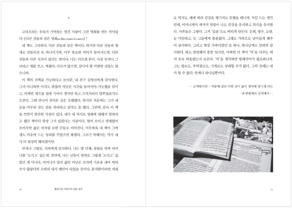 그런 점에서 이 책은 누구도 쓰지 않은 책이다. ‘영화’를 미학적인 입장에서 설명하는 이론서가 아니라, 인간 의식의 역사와 연관 지어 규정하는 데서 출발하며, 그 속성을 가장 잘 설명해줄 수 있는 장치의 하나로써 ‘뱀파이어’를 다루고 있기 때문이다. 빛과 어둠의 히야투스, 간섭, 교차, 서로에 대한 욕망, 이렇게만 말해도 뱀파이어와 영화가 얼마나 친숙한가! 게다가 어떤 소재를 다루고 어떤 이야기를 하든, ‘영화’는 계속해서 이 개념을 우리에게 전사하고 있다. 즉 이는 과거 이야기가 아니며, 현재 우리에게서 움직이는 ‘영화’를 말하는 것이다. 그것이 이미지이며, 이미지의 힘이다.