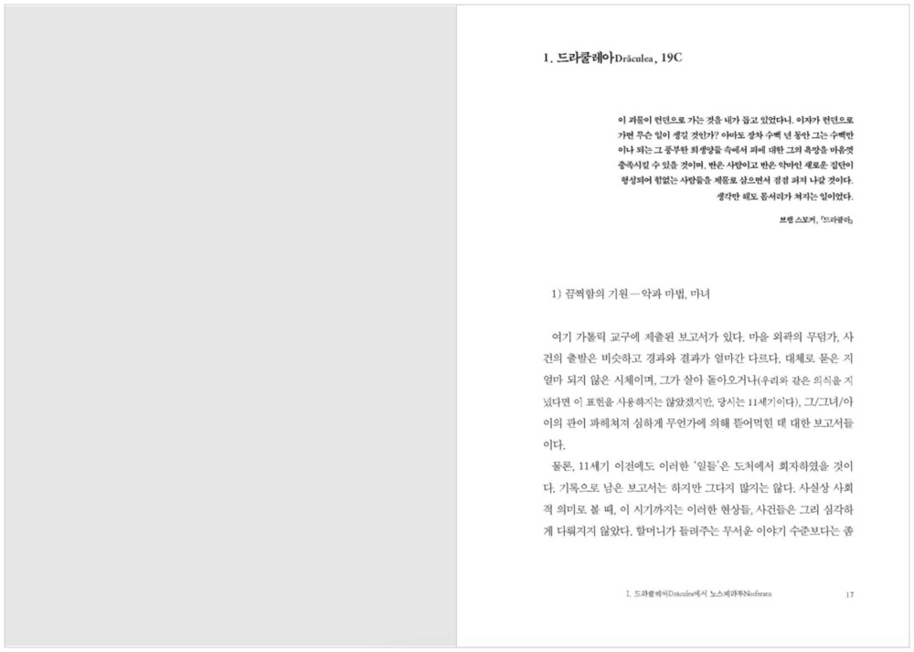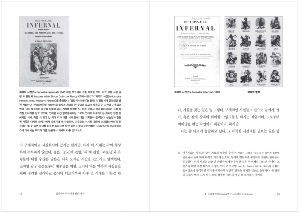 이 책에는 ‘뱀파이어’에 대한 방대한 분량의 자료가 일목요연하게 정리되어 있다. 뱀파이어의 탄생을 설명하기 위해서는 십자군 전쟁이 벌어지던 11세기 이전부터 근대에 이르는 장구한 역사를 필요로 한다. 드라큘라 가문의 시조는 물론 뱀파이어가 발아한 ‘악’을 다루며, 수 세기 동안 기록으로 남겨진 종교적 일화와 기사, 관련 자료들이 함께 제시된다. 중세와 근대를 지나오며 시대에 따라 변천한 악의 역사와 인간 의식의 변화는, 추상이 어떠한 방법으로 구체가 되어 개념으로 자리 잡아 우리 눈앞에 현현하게 되었는지를 보여주는 동시에, 뱀파이어와 영화가 갖는 인접성을 증명한다.