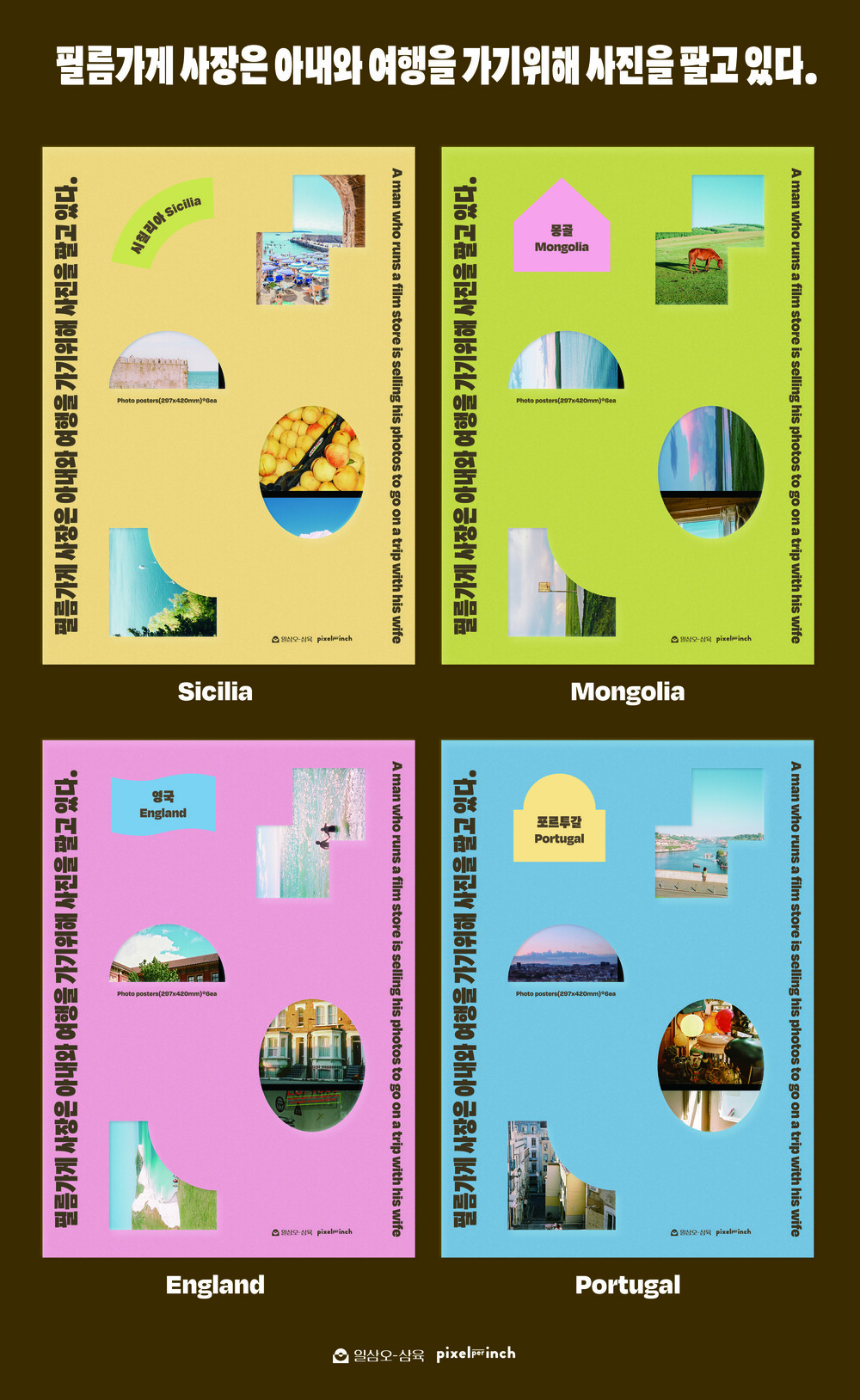 필름가게 사장의 시선으로 담은 시칠리아, 몽골, 포르투갈, 영국의 모습을 담아낸 포스터 모음집입니다. A3사이즈로, 포스터 6장과 밀착 포스터 1장이 담겨있는 포스터집입니다. 시칠리아, 몽골, 포르투갈, 영국을 각각 담은 네 가지 버전으로 제작되었습니다.