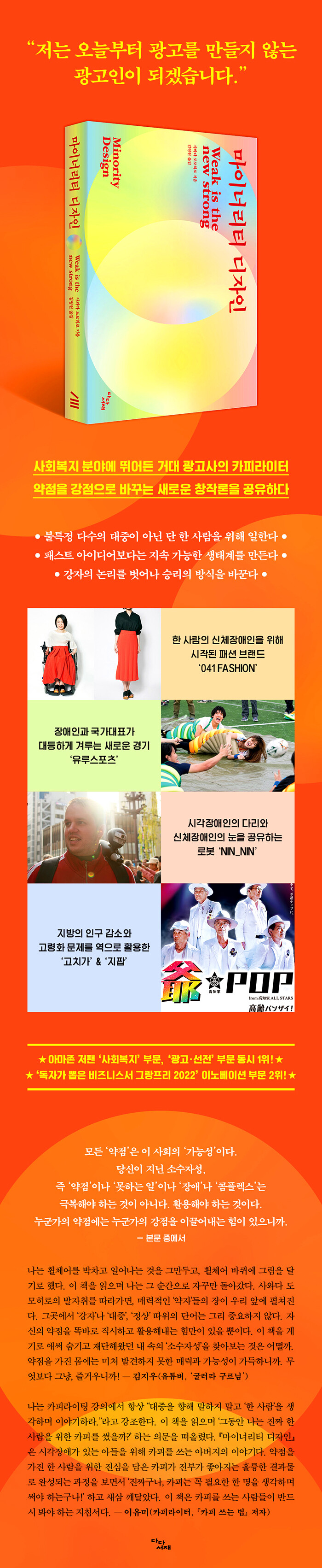 약점, 못하는 일, 콤플렉스, 장애 등을 극복하거나 감추지 않고 당당히 드러내도 괜찮은 세상은 어떻게 만들 수 있을까? 『마이너리티 디자인』은 이 의문에 답하는 책이다. 거대 광고회사의 전도유망한 카피라이터였던 저자는 아들의 시각장애를 계기로 자신의 능력을 사회복지 영역에서 사용하기 시작한다. ‘광고를 만들지 않는 광고인’이 되겠다고 결심한 저자는 스포츠, 패션, 음악, 로봇공학 등 분야를 넘나들며 ‘한 사람의 약점’을 출발점 삼아 기존의 통념을 뒤흔드는 프로젝트들을 진행한다. 저자는 자신의 방식에 ‘마이너리티 디자인’이라는 이름을 붙이고, ‘더 보람 있는 일’을 하기 위한, 그리고 ‘더 좋은 사회’를 만들기 위한 구체적인 방법을 제안한다.