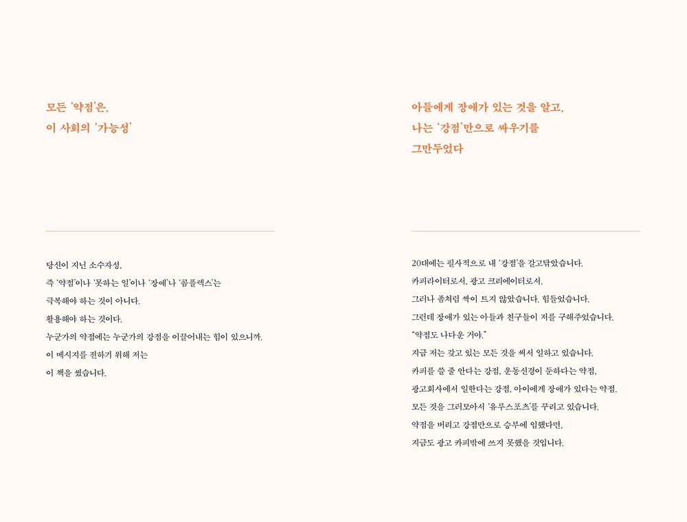 아들에게 장애가 있다는 사실을 알고 저는 절망적인 기분에 빠졌습니다. ‘장애가 있다 = 불쌍하다’라는 등식이 제 속에 있었기 때문입니다. 그렇지만 ‘잠깐만.’이라고 마음속으로 중얼거렸습니다. (…) 못하는 일을 억지로 극복하지 않아도 괜찮아. 사회를 바꾸면 돼. (…) 내가 할 줄 아는 ‘광고’로 장애 당사자를 비롯해 이른바 ‘마이너리티’라고 불리는 이들의 과제를 해결하고 그들의 가치를 빛나게 할 수 있지 않을까. ―본문 86면 중에서