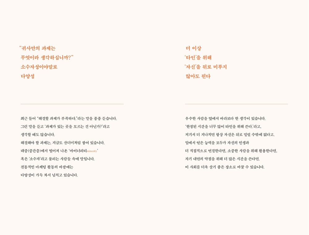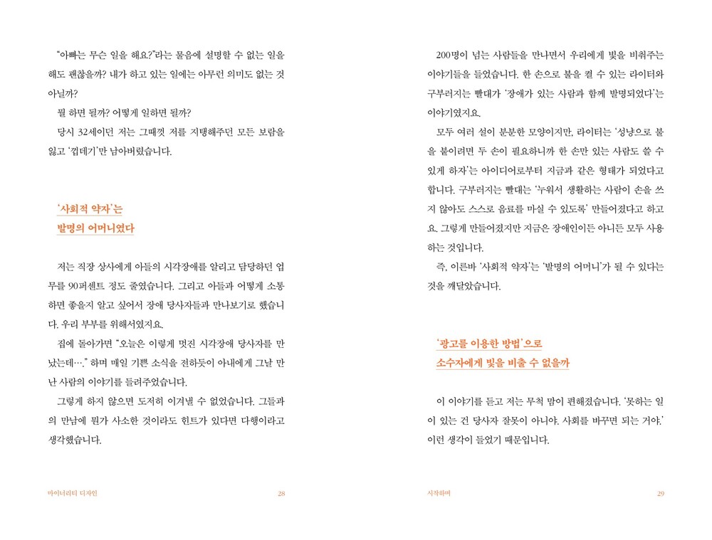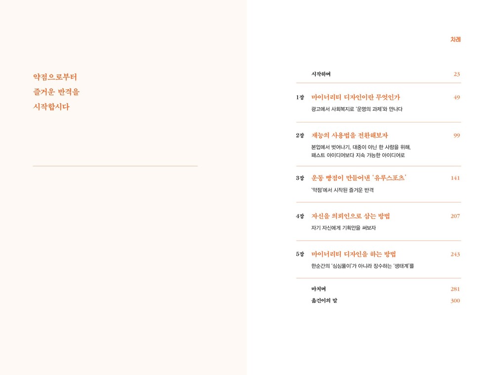 나는 카피라이팅 강의에서 항상 “대중을 향해 말하지 말고 ‘한 사람’을 생각하며 이야기하라.”라고 강조한다. 이 책을 읽으며 ‘그동안 나는 진짜 한 사람을 위한 카피를 썼을까?’ 하는 의문을 떠올렸다. 『마이너리티 디자인』은 시각장애가 있는 아들을 위해 카피를 쓰는 아버지의 이야기다. 약점을 가진 한 사람을 위한 진심을 담은 카피가 전부가 좋아지는 훌륭한 결과물로 완성되는 과정을 보면서 ‘진짜구나, 카피는 꼭 필요한 한 명을 생각하며 써야 하는구나!’ 하고 새삼 깨달았다. 이 책은 카피를 쓰는 사람들이 반드시 봐야 하는 지침서다.