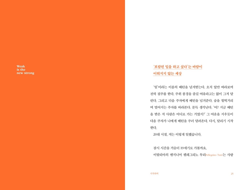 과거 제가 낸 아이디어는 ‘Speed(빠르고)’ ‘Scale(크고)’ ‘Short(짧은)’ 아이디어였습니다. 즉, 재빠르게 아이디어를 내서 되도록 많은 사람들에게 알리고 짧은 기간에 그 역할을 마쳤습니다. 그렇지만 지금은 다릅니다. 이제 ‘Slow(느리고)’ ‘Small(작고)’ ‘Sustainable(오래 지속되는)’ 아이디어를 추구합니다. 천천히 작은 것을 만들어서 차근차근 키워갑니다. 그렇게 하면 아이디어는 지속 가능한 것이 되어 오래 살아남습니다. ―본문 204면 중에서