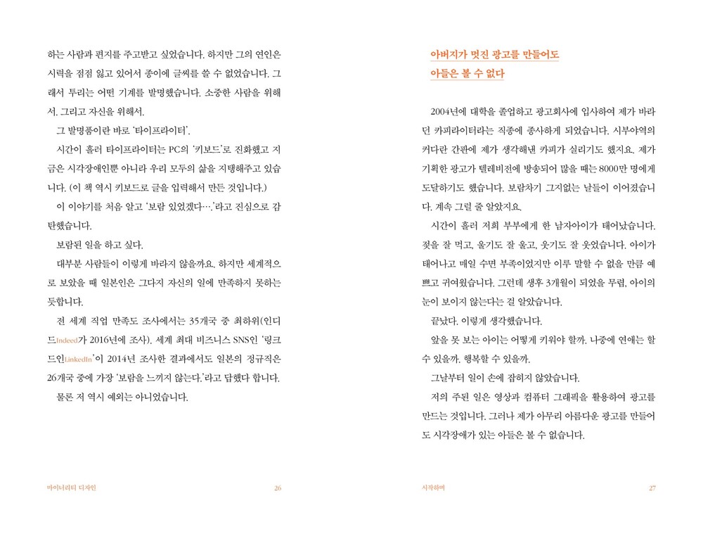 ‘마이너리티 디자인’에서는 한 사람 한 사람을 웃게 만들었다는 감촉이 뚜렷하다고 한다. 기존의 광고와 관점이 다른 것이다. 읽기만 해도 마음이 두근거리는 책이다.