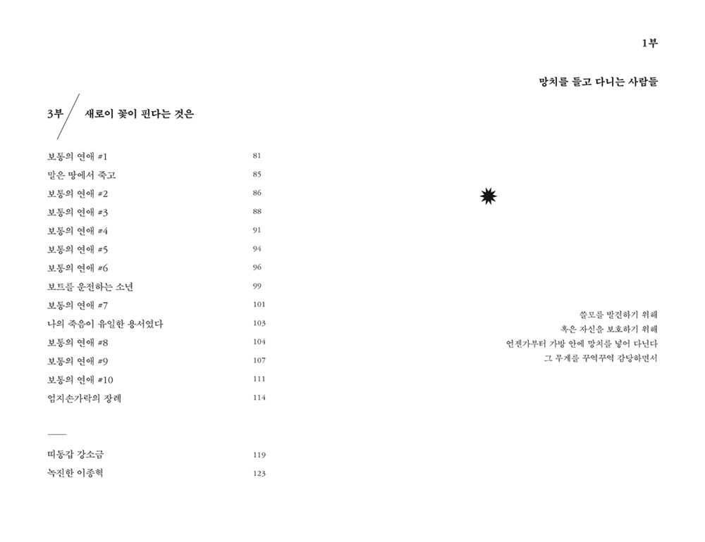 81 보통의 연애#1_ 85 말은 땅에서 죽고_ 86 보통의 연애#2_ 88 보통의 연애#3_ 91 보통의 연애#4_ 94 보통의 연애#5_ 96 보통의 연애#6_ 99 보트를 운전하는 소년_ 101 보통의 연애#7_