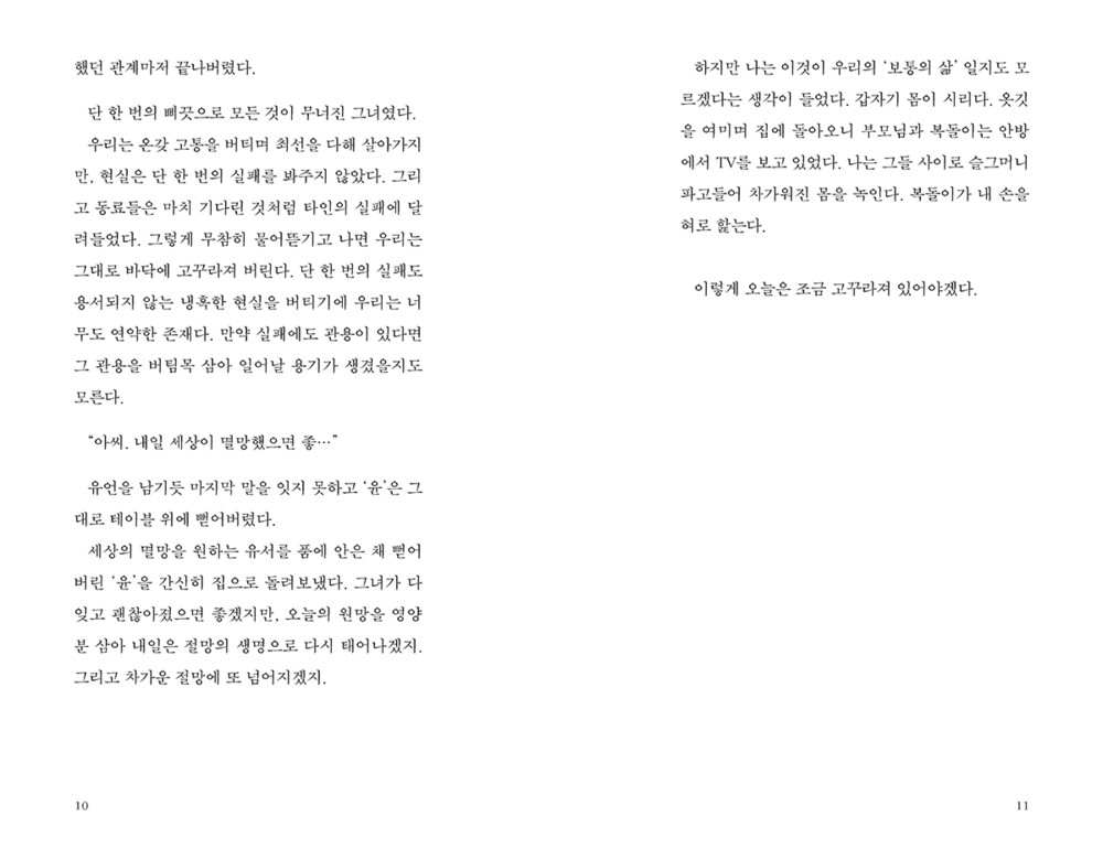 우리는 자주 꼬꾸라지기도 하고, 아슬아슬하게 버티기도 하고, 무탈히 지내기 위해 가면을 쓰기도 한다. 그리고 때론 이러지도 저러지도 못하는 애매한 인간이 되기도 한다. 사실 이 모든 것은 무거운 삶도 그렇다고 가벼운 삶도 아니다. 그저 우리의 ‘보통의 삶’일 뿐.