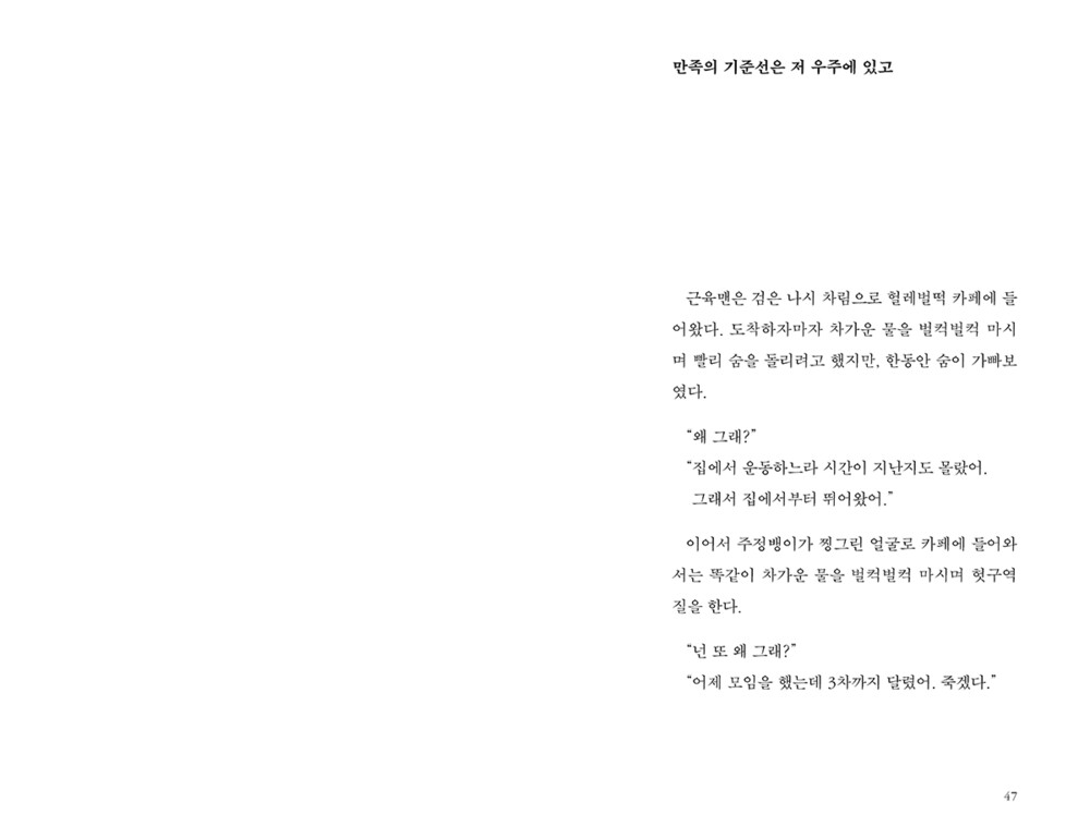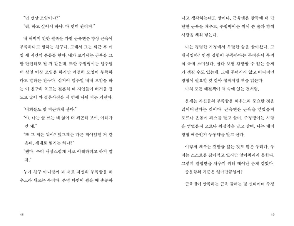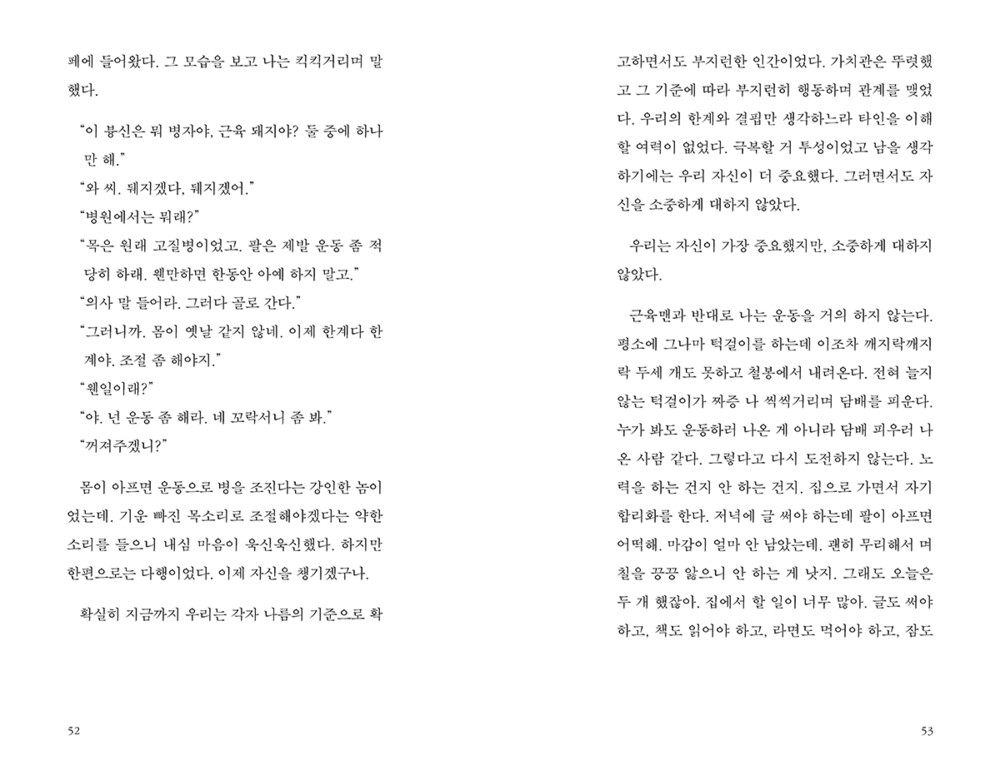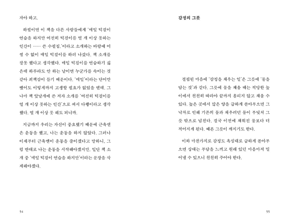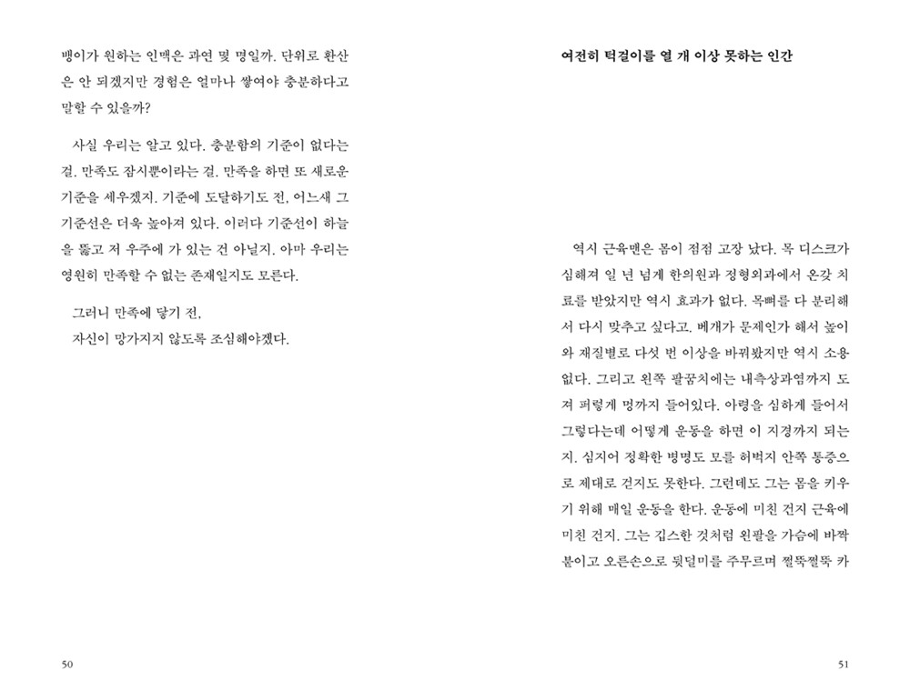 47 만족의 기준선은 저 우주에 있고_ 51 여전히 턱걸이를 열 개 이상 못하는 인간_ 55 감정의 그릇_ 56 그들을 향해 꾸역꾸역 달린다_58 귀의 두께_ 59 우리는 최선을 다해 다른 사람이 되고_ 61 가끔, 종종, 보통_ 62 하나로 규정할 수 없는 우리_