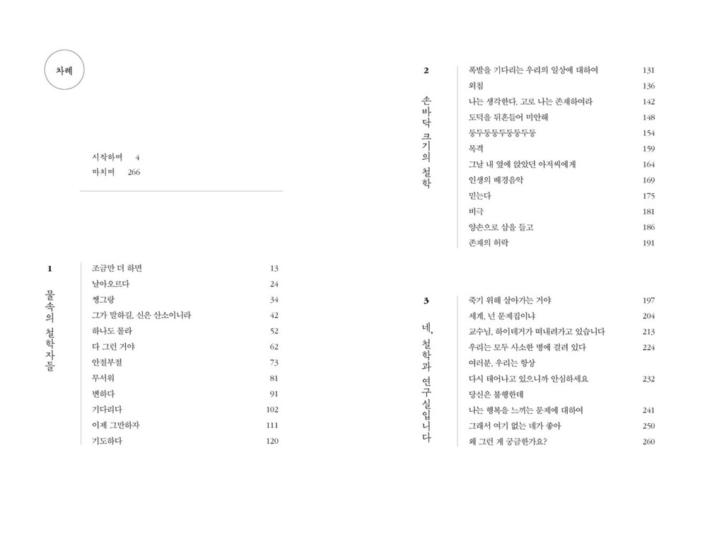 그러나 저자는 부서지고 무너지는 동시에 새롭게 태어나고 완성되는 것이 철학이라고 이야기한다. 철학은 궁극의 답을 가르쳐주거나 난제를 해결해주지 않지만, 일방적으로 가르치지도 강요하지도 않는다. 철학은 괴로운 현실과 마주한 우리가 “다 그런 거야.”라는 수동적인 태도에 빠지지 않고, 자신의 상황에 ‘질문’을 던지면서 ‘다른 목소리’를 들어볼 수 있게 해준다.