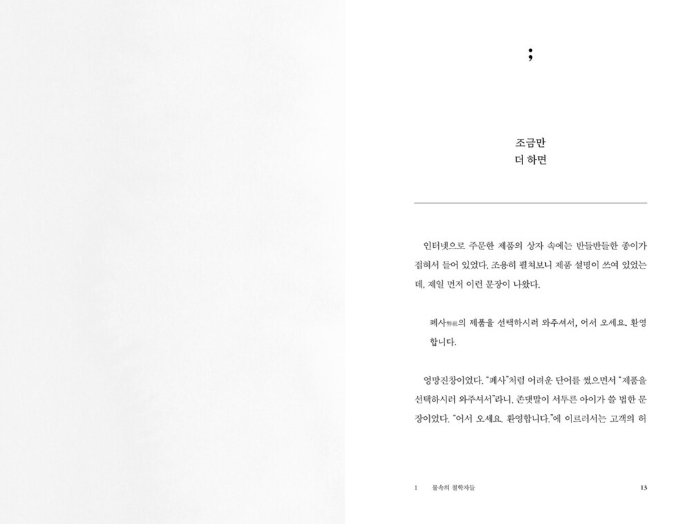 한껏 꾸민 미용사가 내 뒤로 와서 싱긋 웃으며 “어떻게 하고 싶으세요?”라고 친절하게 묻는다. “어떻게 하고 싶으세요?”라는 질문은 ‘당신은 어떤 사람이고 싶나요?’라는 뜻인 동시에 ‘당신은 어떤 인생을 보내겠어요?’라는 뜻이기도 하다. 미용사의 대수롭지 않은 질문은 점점 확장되어 ‘어떻게 살아갈 것인가.’ 하는 근본적인 질문으로 이어진다. 철학이다. 철학이 벌어지고 있다. _본문 160면 중에서