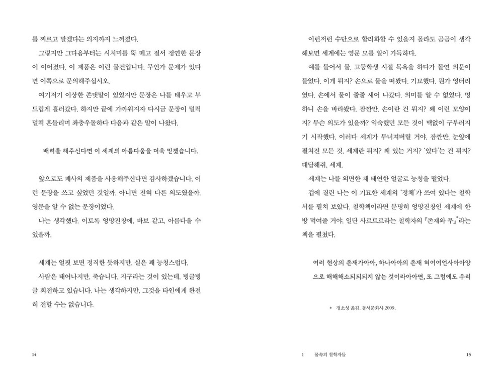 어떤 단어들은 자신의 이름으로부터 빠져나올 때에야 비로소 자기 자신이 되는 것 같다. ‘행복’처럼 말이다(행복의 상태에 도달하기 위해 가장 먼저 해야 할 일은 행복에 대한 생각을 그만두는 것이니까). 나는 이 책을 읽으며 처음으로 ‘철학’이라는 단어 없이 철학할 수 있었다. ‘철학’이라는 철사 같은 단어 대신 시들한 채로 내 안에서 사라지지 않던 질문들이 싱싱해져서는 마구 까불기 시작했다. 넌 누구야? 너는 대체 누구야? 모르는 사람처럼 묻고 있다. 요조가 요조로부터 빠져나오고 있다. 나는 이 책과 함께 더욱 요조가 될 수 있을 것이다.