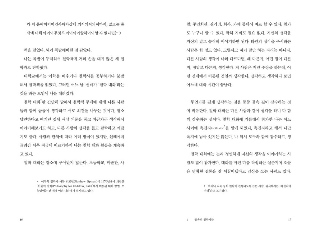 철학은 모든 사람과 관계를 맺는다. 모든 것에 관여할 수 있다. 중요하지 않다고 치부했던 것 역시 철학 대화에서는 생각해볼 수 있다. 오히려 평소에 잊고 지냈던 것이나 어떤 의문도 품지 않았던 것에 귀를 기울인다. 논의 자리에서 중요시되지 않으며 굳이 들을 필요가 없다고 여겨지던 사람의 이야기도 귀담아듣는다. _본문 89면 중에서