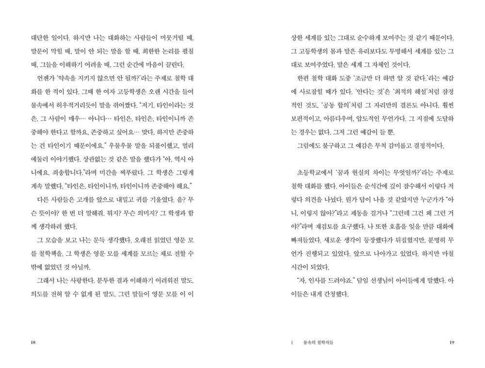“철학 대화는 돌봄이다. 철학은 지知를 돌본다. 진리를 돌본다. 타인의 생각을 듣는 나를 돌본다. 입장이 변하는 것을 겁내는 나를 돌본다. 당신의 생각을 돌본다.”