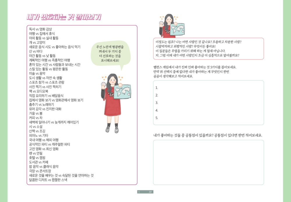 질문을 통해 내가 선호하는 것과 나의 일 스타일을 파악하고 조금은 극단적인 밸런스 게임을 통해서 나를 더 파해치고 나의 성격, 취미 및 특징에 대해서 더 알아보며 나를 통달하기
