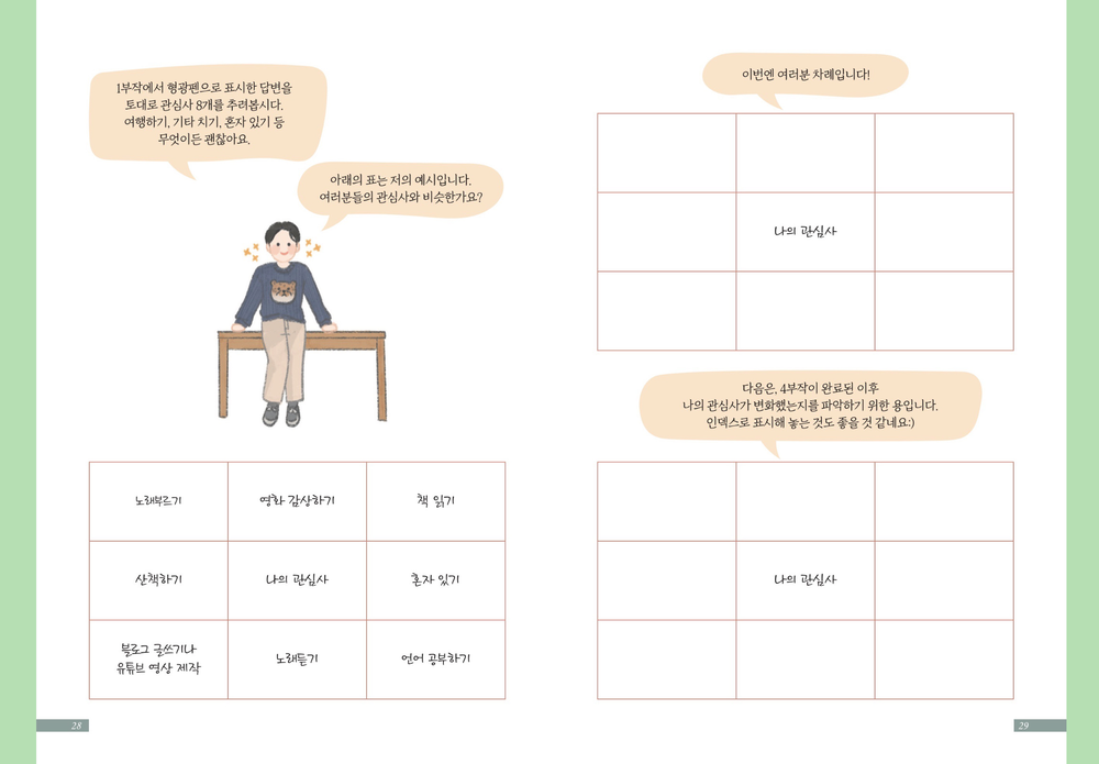 빙고판을 활용해서 사부작러의 관심사를 적고, 각 관심사에서의 한 명 혹은 여러 명의 롤모델을 생각해보며, 빙고판을 이용하여 사부작러가 추구하는 가치에 맞는 롤모델 선정하고 롤모델의 발자취 따라가보기